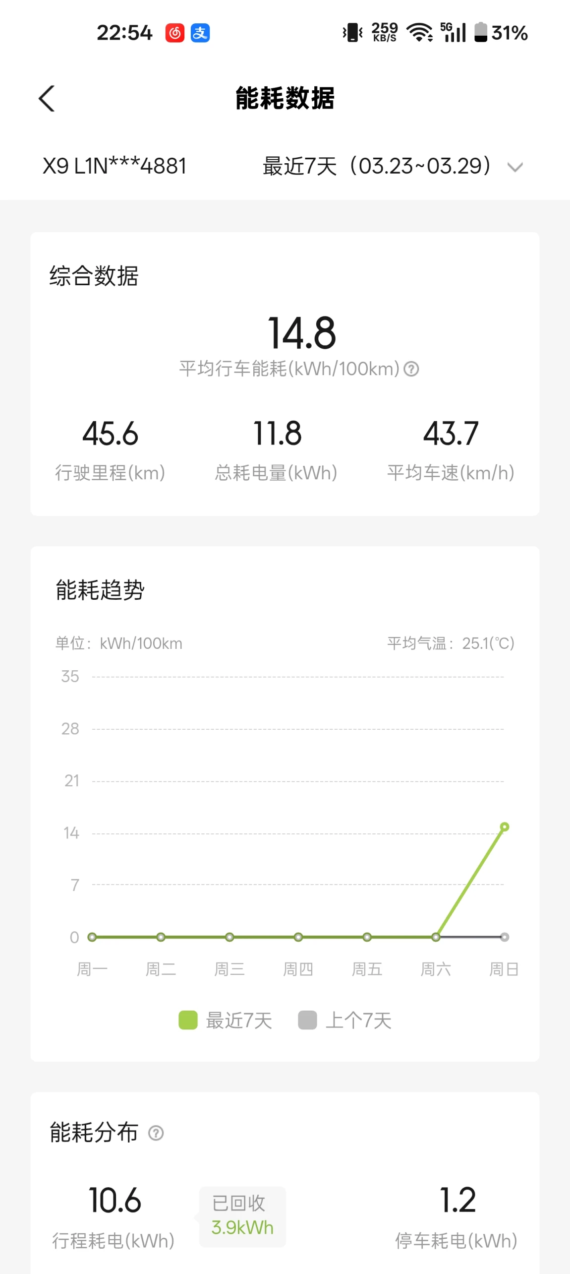 提车后第一次上路就覆盖了高速、高架与城市道路,一共开了四十多公里,平均时速40km,百公里电耗居然低至14.8,比预想中还要经济实用。5米多的大车开起来灵活好开,空间、舒适与智能全面兼顾,越开越满意,正式开启美好出行新生活!