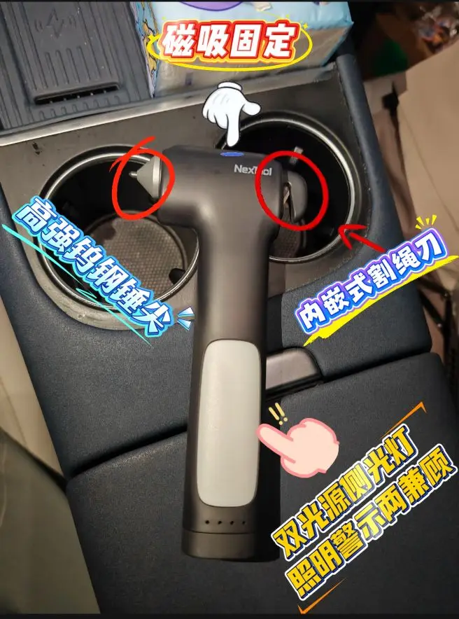 这次我又种草了商城的多功能应急安全锤,除了高强钨钢锤尖和内嵌割绳刀,还带了双光源侧光灯,日常照明、应急警示都能用,放在杯架里刚好,能给出行多添一份安心。