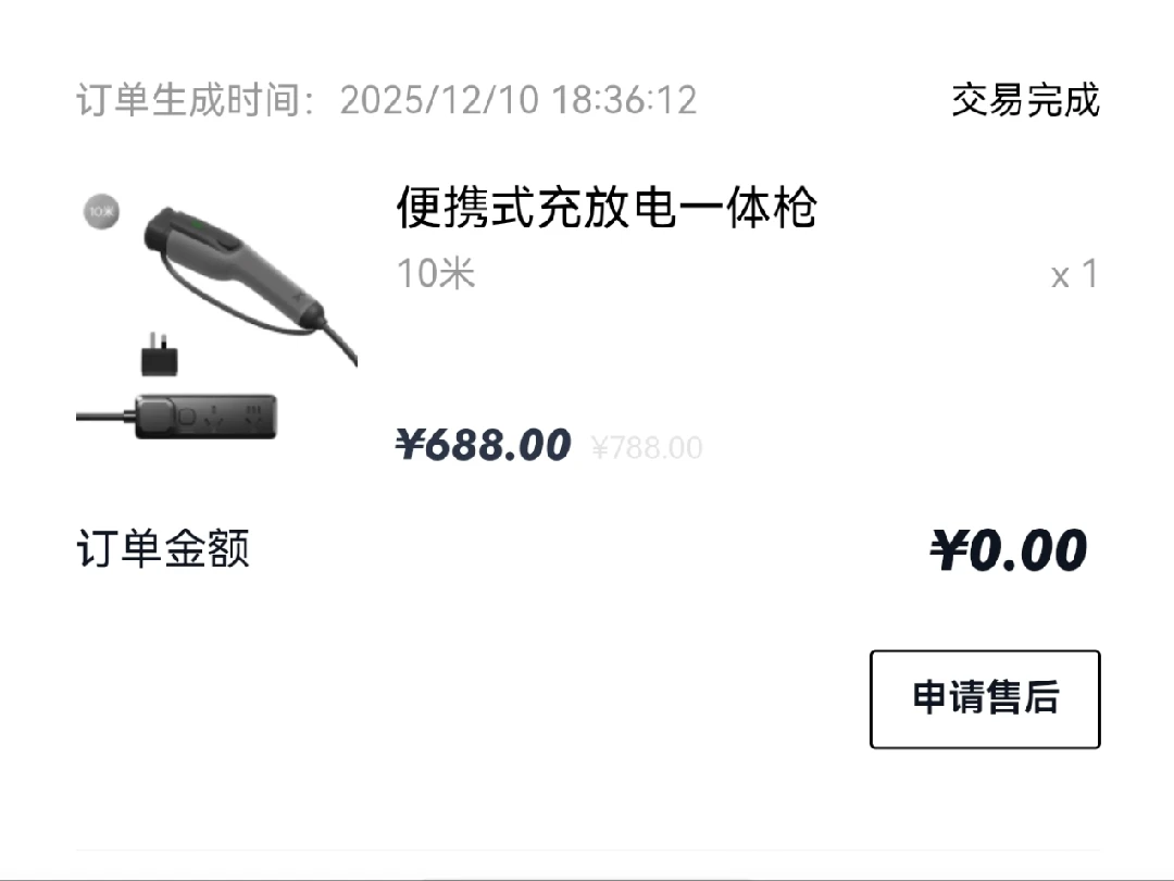 第一单买的就是充放电一体枪,说来惭愧,买车一个想法就是出去玩儿的时候能够露营放电,所以毫无疑问第一单的就是这个充放电一体枪,全部用的买车送的积分购置的。