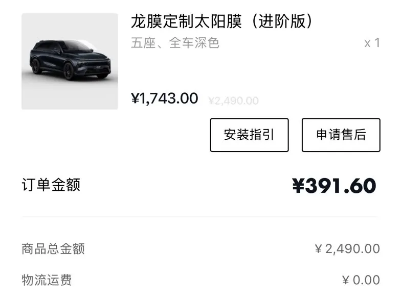 #好物分享# 小鹏商城薅羊毛成功!原价2490的龙膜定制太阳膜(进阶版),现在有活动,攒的积分都用了。指定门店安装省心,隔热和隐私效果超棒,夏天开车再也不怕晒,性价比绝了,车友们冲!