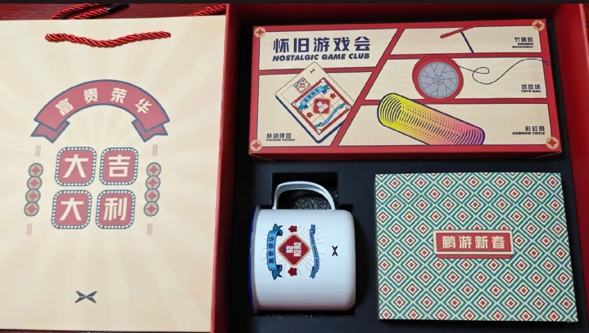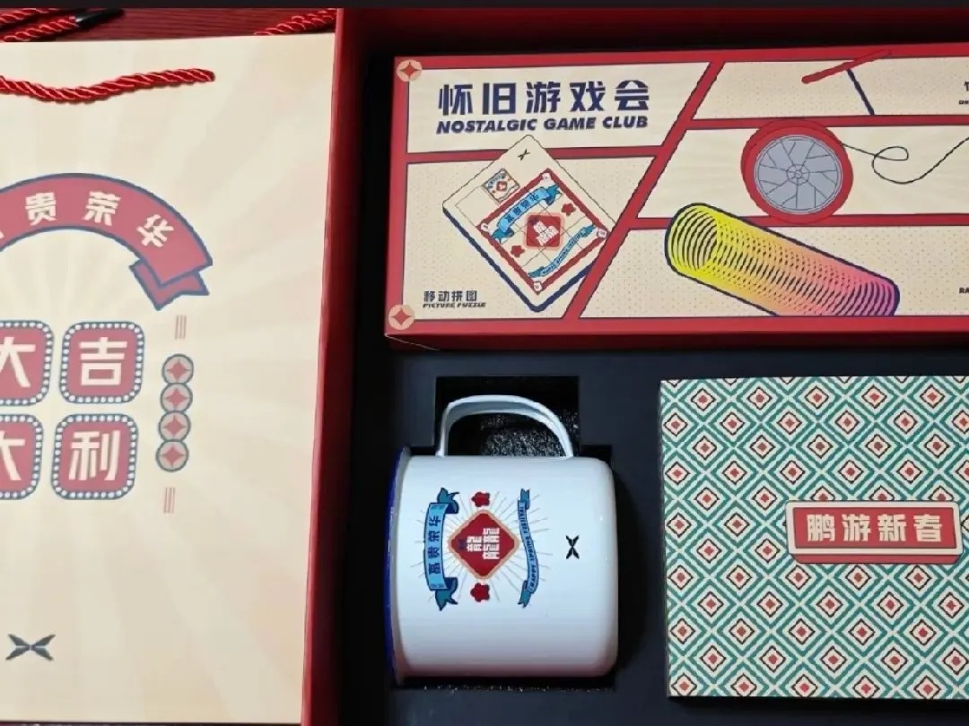 内容物更是诚意满满:复古掌机、X9轮毂悠悠球、竹蜻蜓、彩虹圈等9件童年好物,每一件都藏着怀旧情怀。定制搪瓷杯印着“富贵荣华”,还有“东南西北”折纸、龙年红包,细节处融入小鹏汽车元素,将机械龙图案与品牌特色巧妙结合。