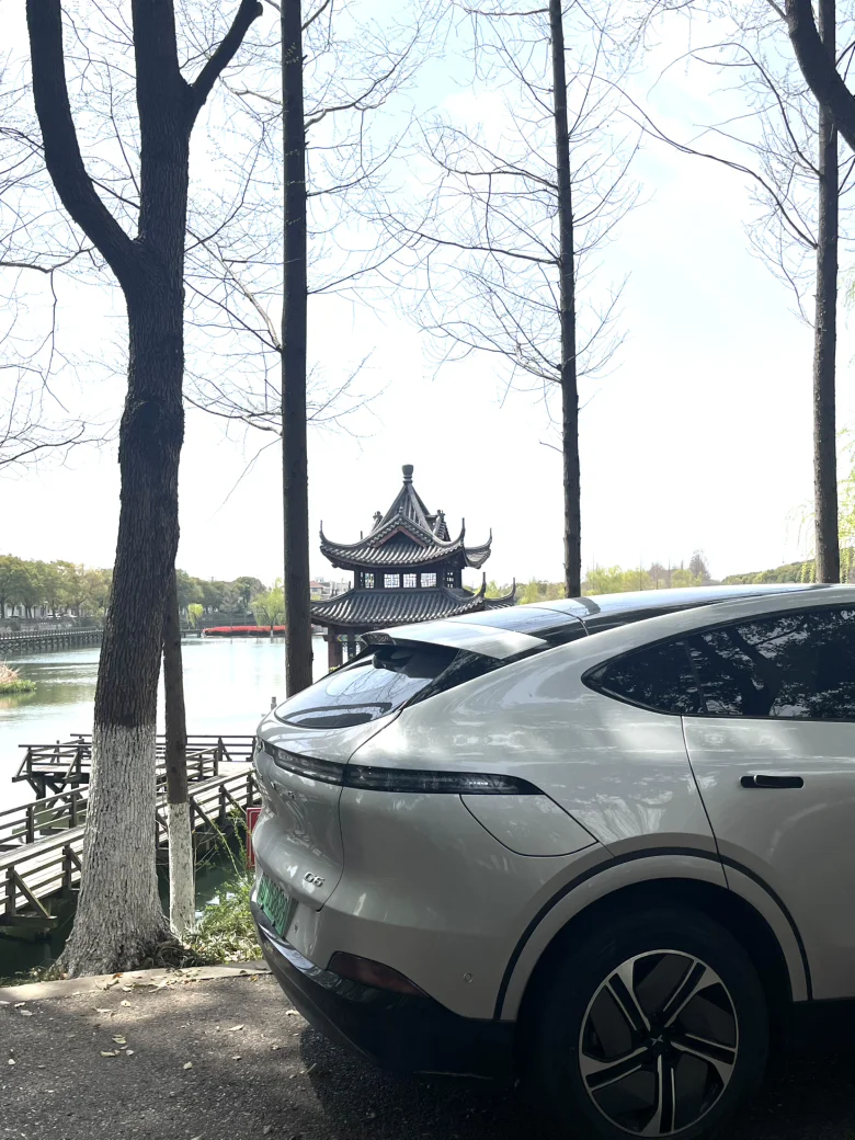 这次出来,我也给小鹏拍了不少照片。车子停在花树旁、河边、凉亭边,和海棠、樱花、油菜花配在一起,随手一拍都很好看。既有春日的温柔,又有家人在身边的温暖,每一张照片都很有意义。
