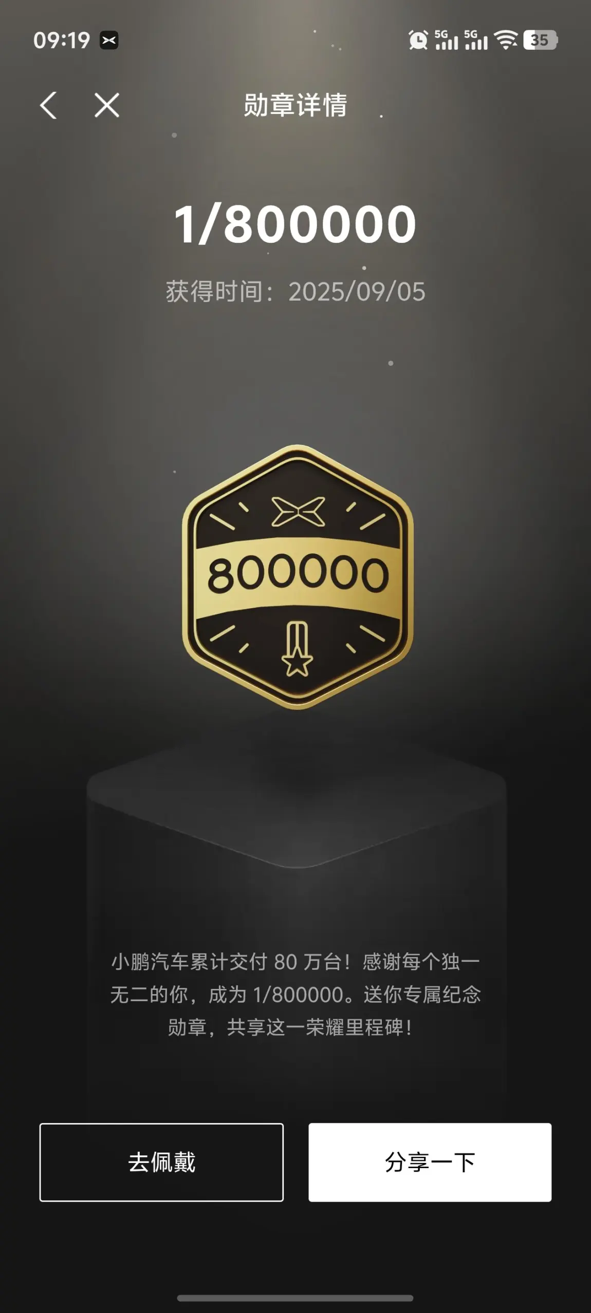 2025年9月,我拿到了「1/800000」交付纪念勋章,那天看着屏幕上的文字,突然就有了很强的共鸣——我不仅是一名小鹏车主,更是小鹏汽车累计交付80万台的见证者与参与者。