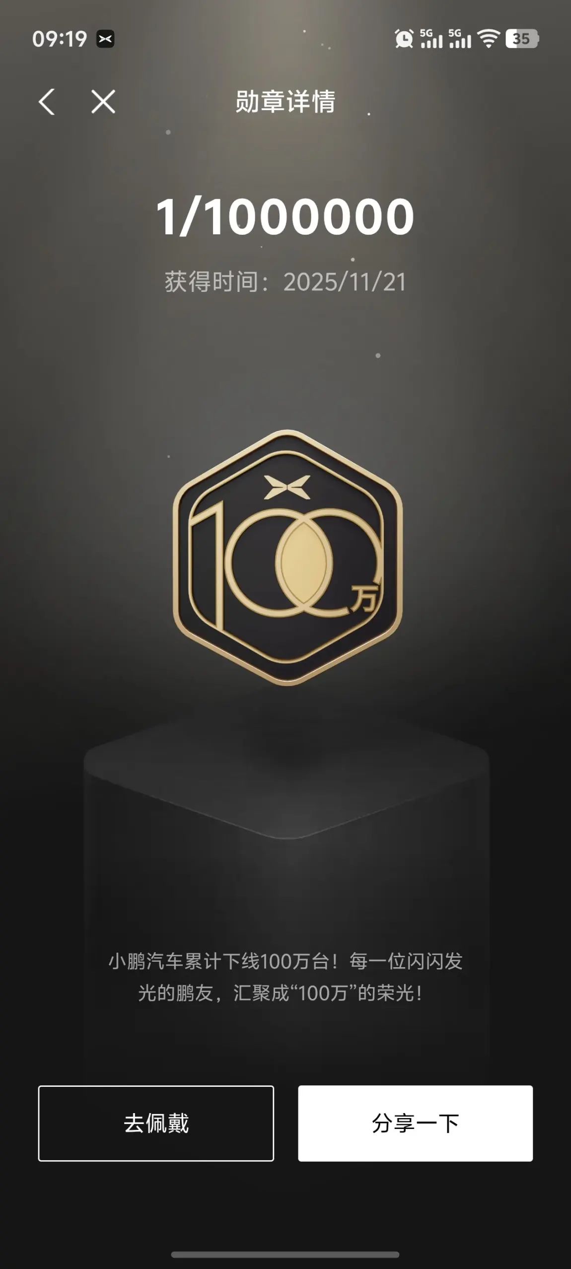 没想到仅仅两个多月后,2025年11月,我又解锁了「1/1000000」下线纪念勋章,成为了小鹏百万车主中的一员。从80万到100万,我陪着小鹏跨过了一个又一个里程碑,这种和品牌一同成长的荣耀感,是这两枚勋章给我的独家记忆。