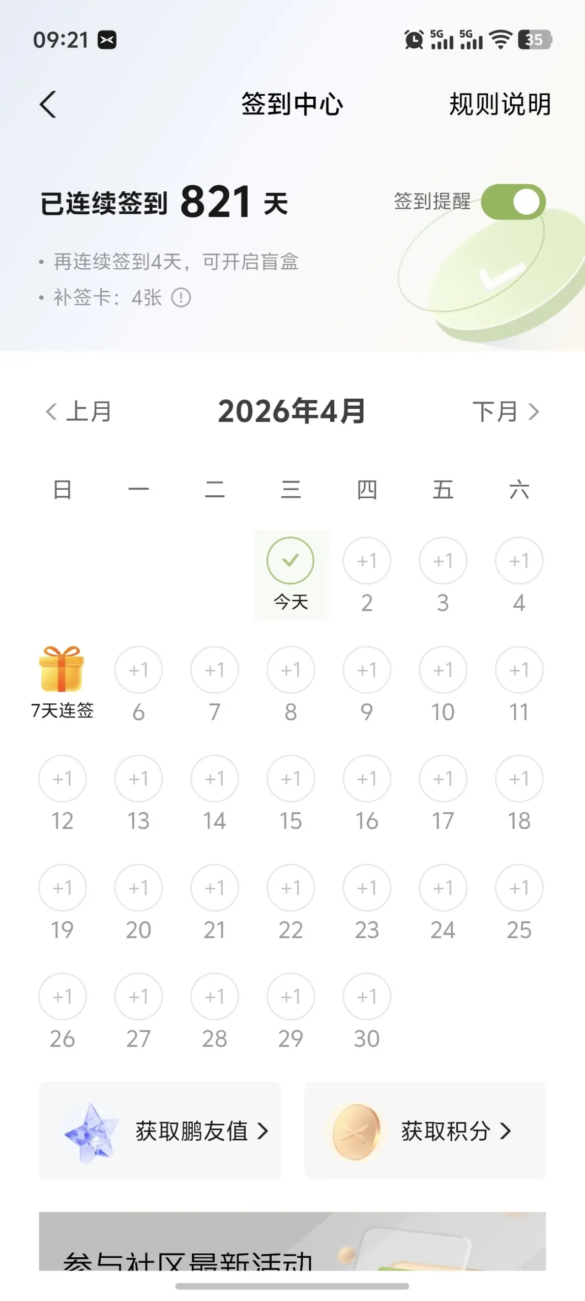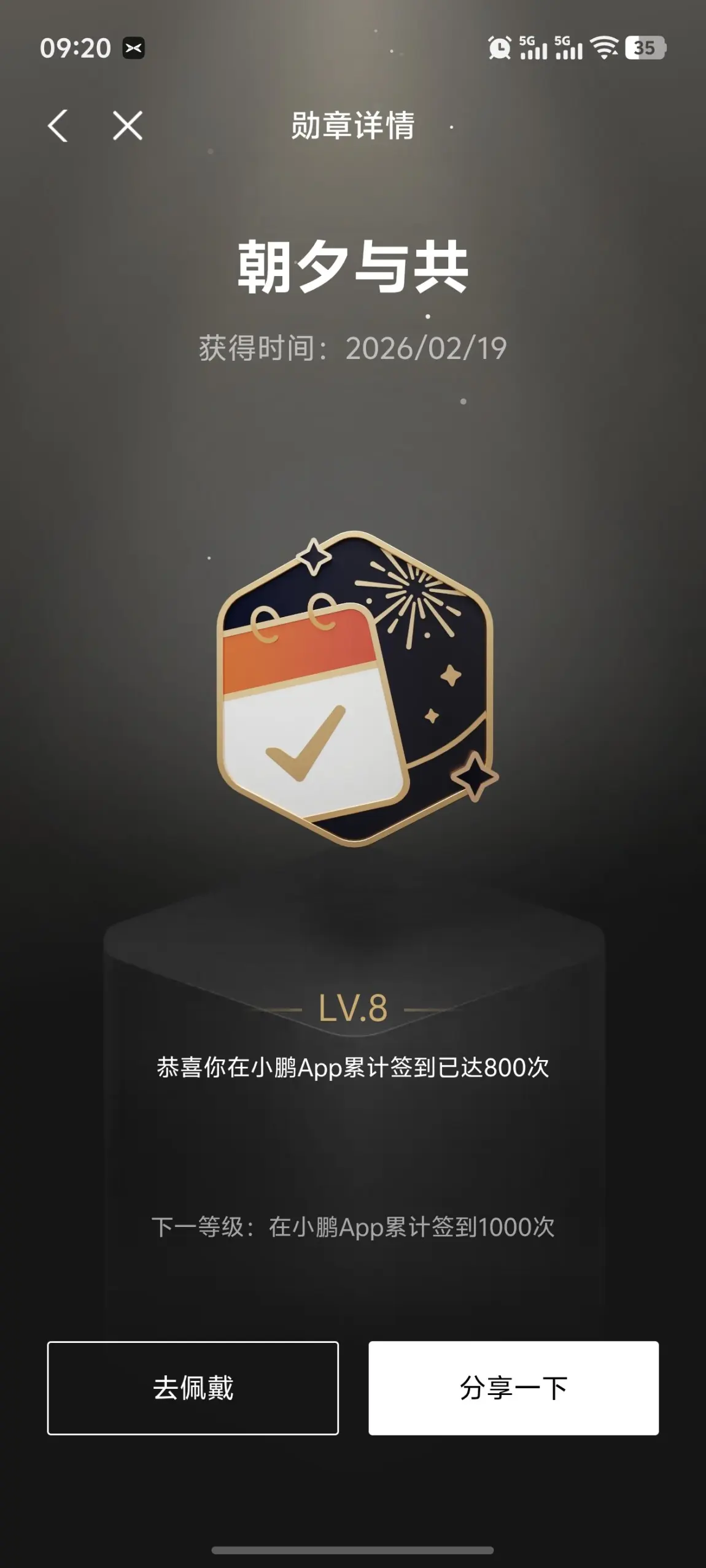 到今天,我已经在小鹏APP连续签到821天了。从提车的第一天起,每天打开APP签到,就成了我雷打不动的习惯。2年多的时光,800多次的点击,这枚勋章从来都不只是一个数字,而是我对小鹏最长情的陪伴,是日复一日的热爱与坚持,最终开出的花。