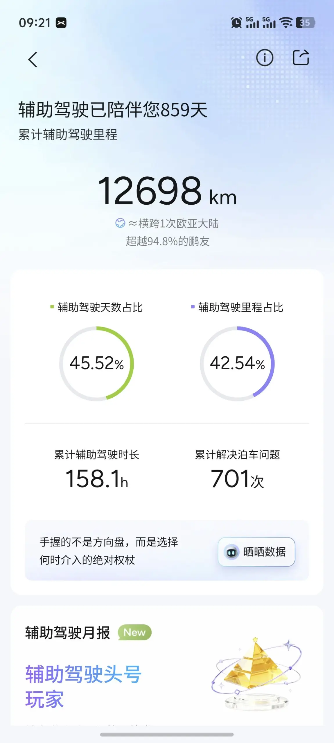 到今天,小鹏的辅助驾驶已经陪伴了我859天,累计辅助驾驶里程达到了12698km,超越了94.8%的鹏友,还帮我解决了701次泊车难题。从最开始第一次用LCC时的小心翼翼,到后来长途高速全程依赖NGP的安心,再到现在早晚高峰通勤、狭窄地库泊车都离不开智驾辅助,小鹏的智驾真的彻底改变了我的出行方式,把开车的疲惫变成了一路的轻松。这枚勋章,就是我和小鹏智驾一同成长的最好证明。