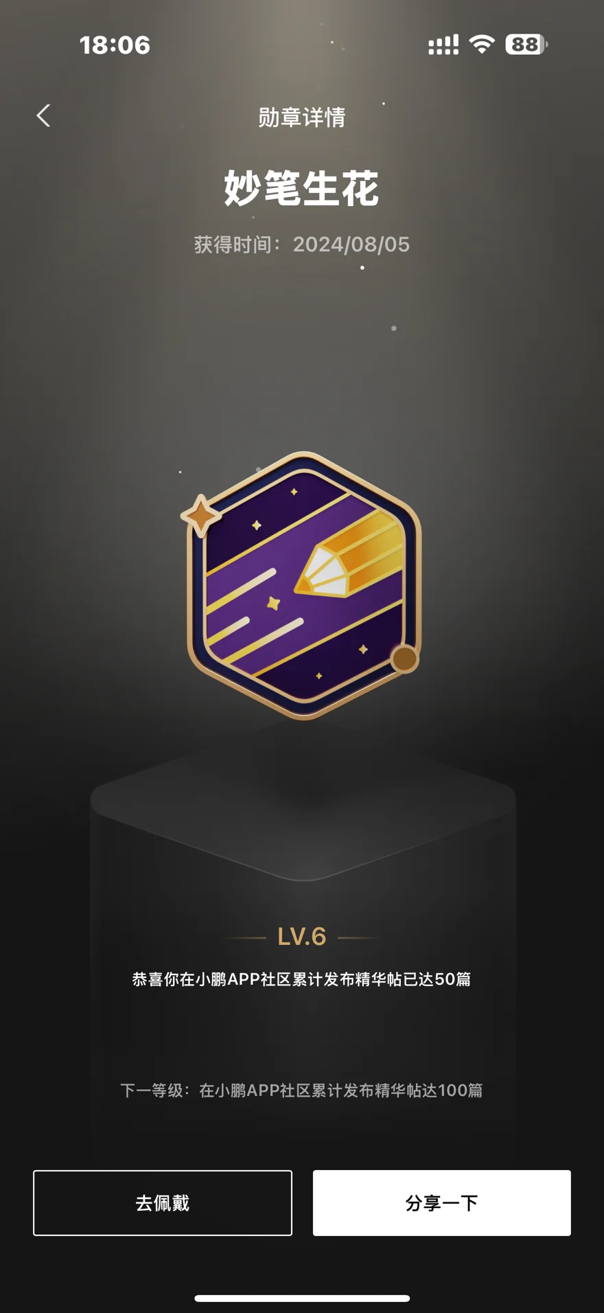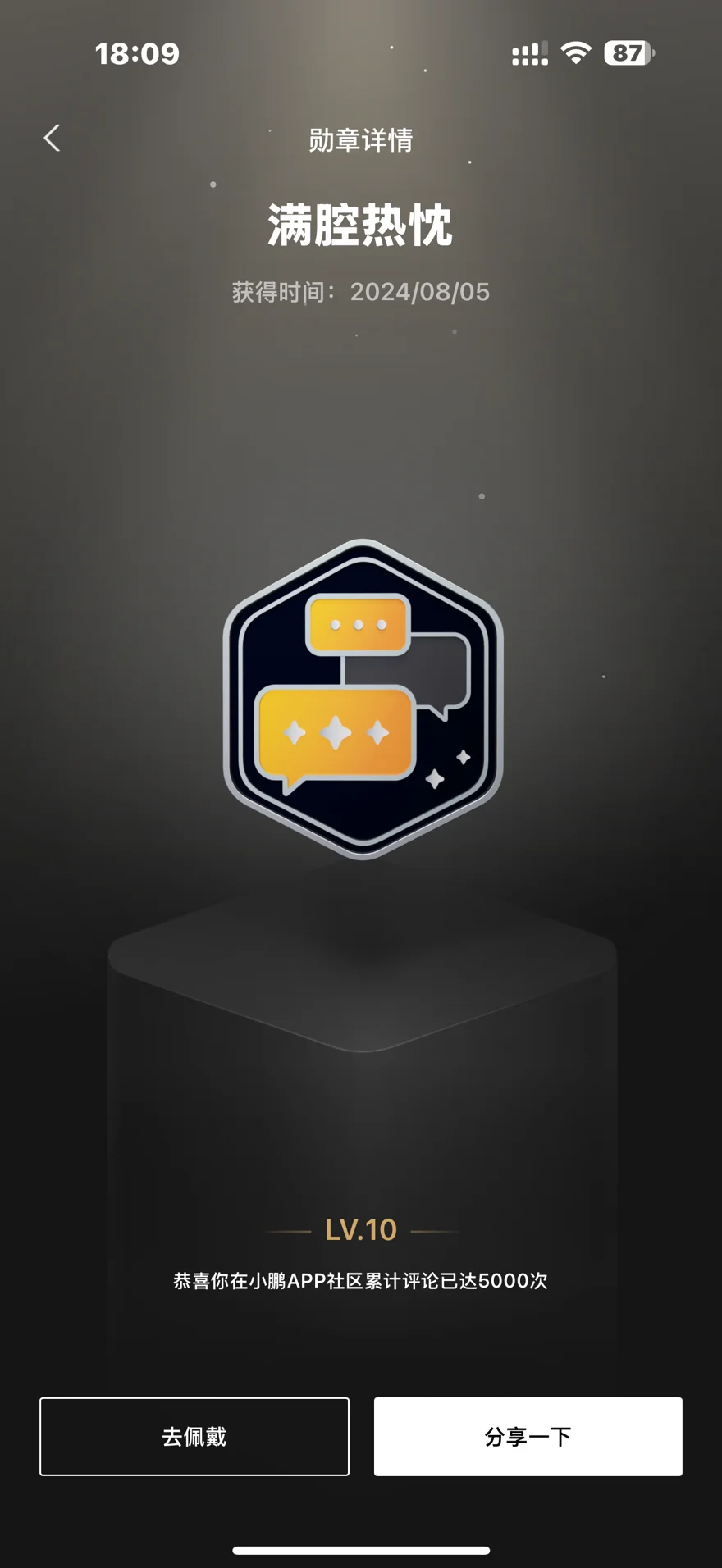 这枚满级勋章,是我对小鹏最纯粹热爱的具象化表达!从2022年成为X-walker,到如今一路陪伴小鹏走过6年多(2019年至今)我始终满怀热忱地关注着小鹏的每一次成长、每一次迭代。这枚勋章记录了我对小鹏的一路追随,也见证了我从普通车主到认证创作者的身份转变,是我与小鹏双向奔赴的最好见证。