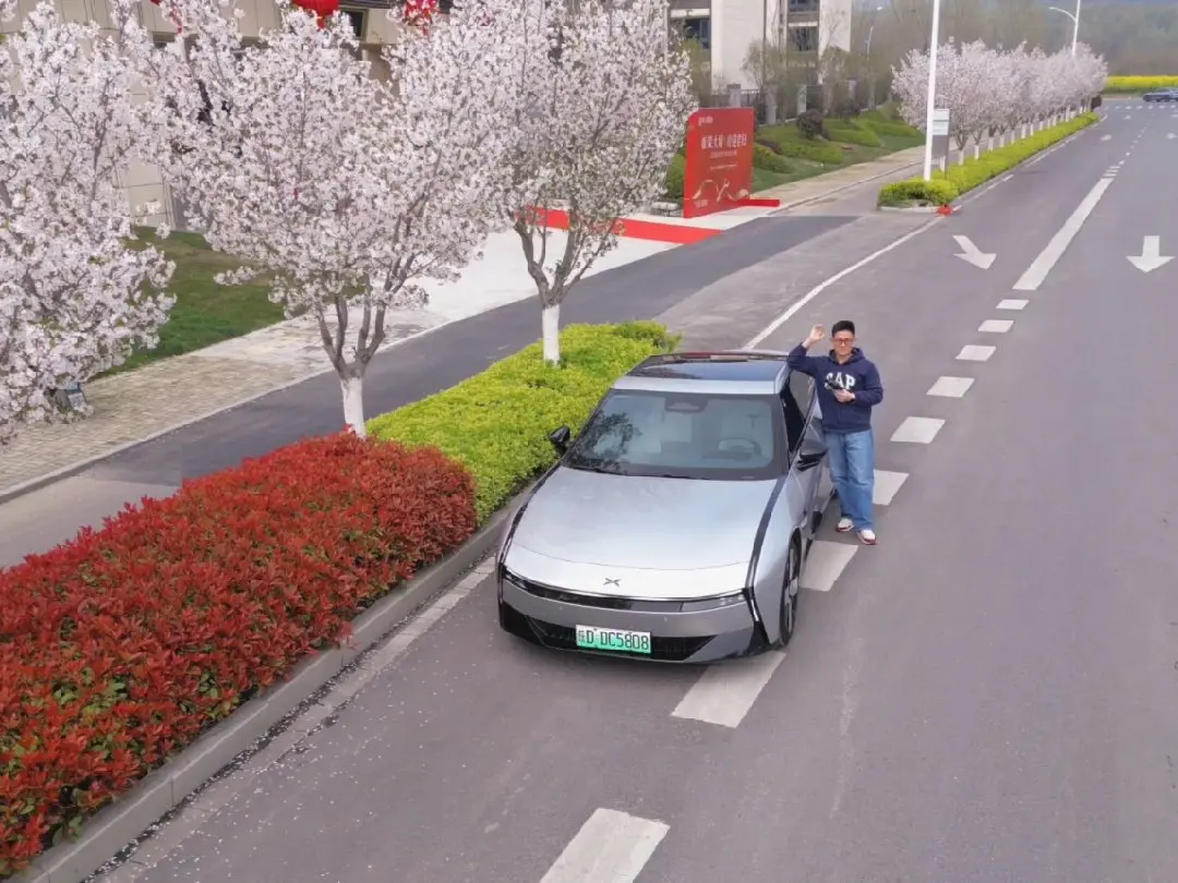 开着小鹏P7穿行粉白花海,车身与樱云同框,春风拂过落樱纷飞,