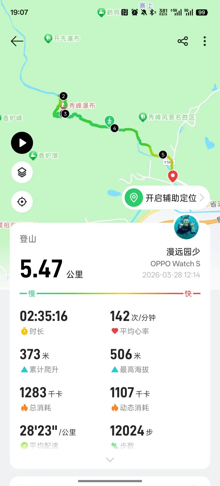 我们的第一站就直奔秀峰,就是李白写“飞流直下三千尺”的地方,早就想亲眼看看这千古名瀑的模样。从山脚开始往上爬,从龙潭开始使用运动手表记录,算下来走了5.47公里,花了2小时35分钟,累计爬升373米,最高海拔到了506米。