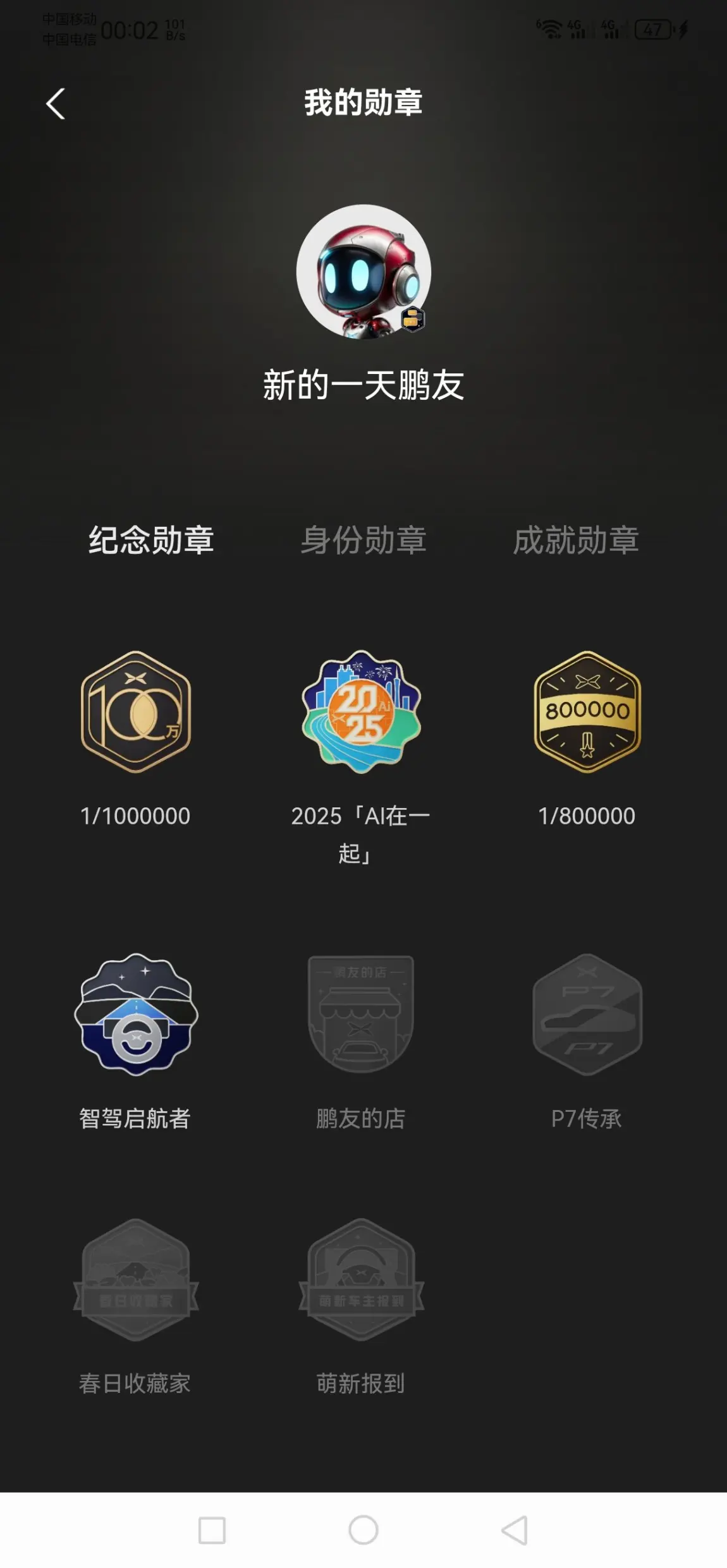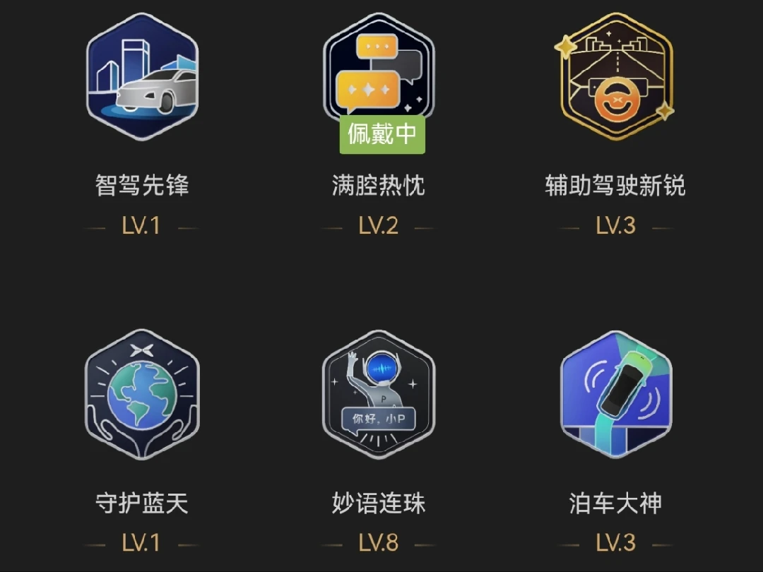 #晒晒我的勋章# - 智驾启航者:首次体验智驾功能纪念 。终于是同行人中智驾的佼佼者。 1/1000000、1/800000:小鹏第100万/80万台整车下线纪念,车主专属,超有收藏价值 。