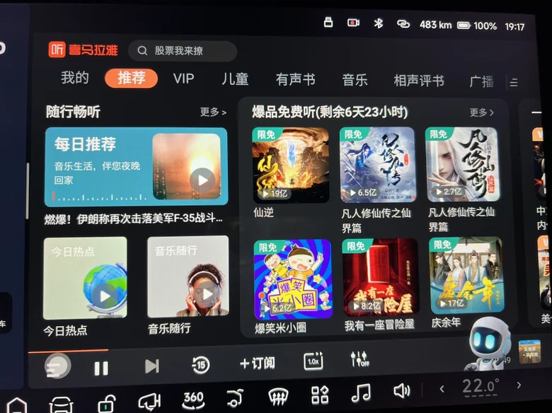 喜马拉雅内容超全,有声书、相声、新闻、播客、儿童故事全都有,开车时候音乐听累了不单调。也是语音轻松控,喊一声“小P”就能搜节目、换集数、调音量,安全又方便。音频专属体验不干扰驾驶,纯听不费眼,比看视频更适合行车途中。断点续播超省心,手机听了一半,上车还能接着听,无缝衔接太爽了。在车上休息等人以及充电时候的好搭档,安静听书听故事,无聊的时间也很充实。APP界面简洁流畅,车机大屏操作顺手,不卡顿、不影响驾驶。