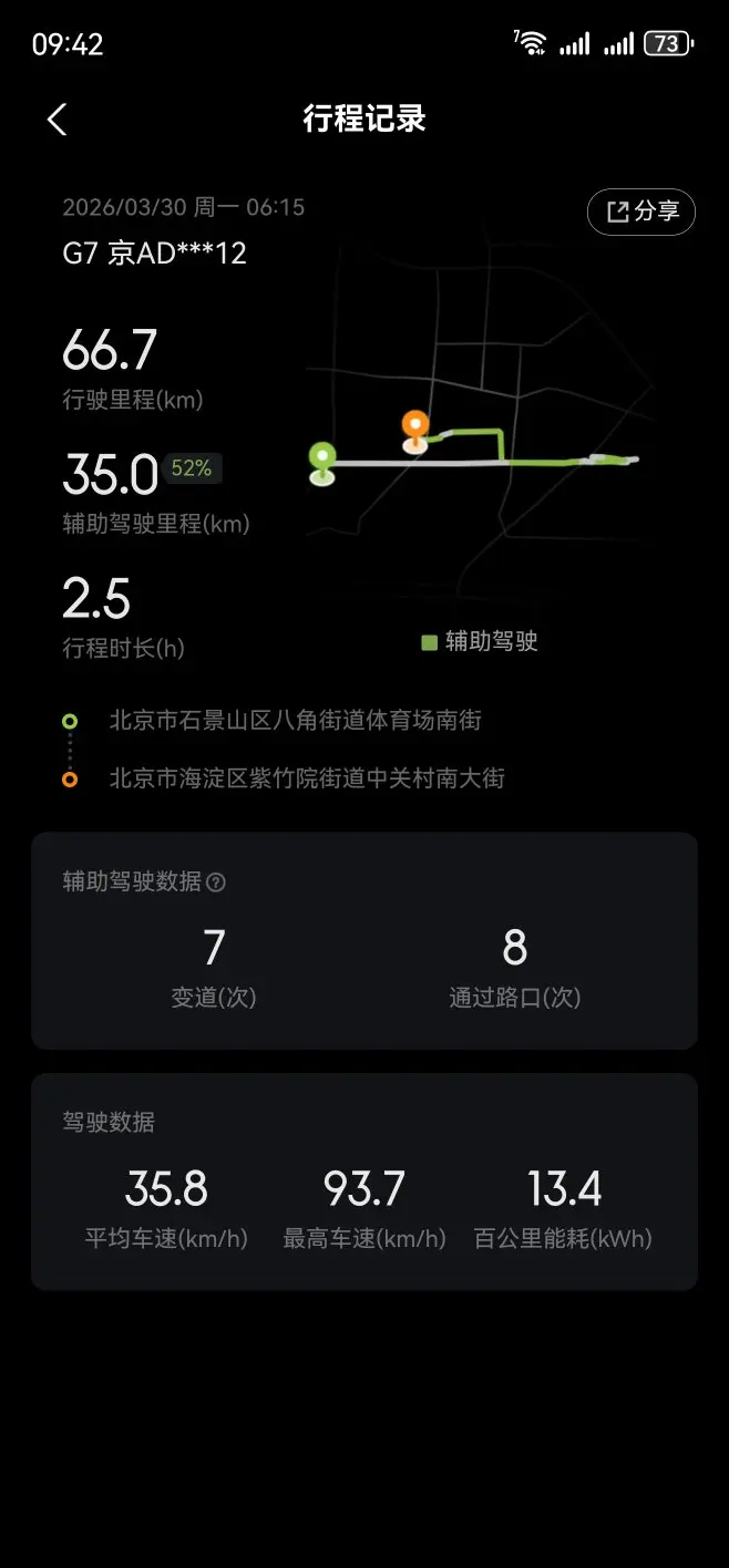 每次出发前不需要打开app就能够直接查看车辆状态,每次行程结束能够直接第一时间查看行程信息,最主要的是能耗数据和智驾数据😜
