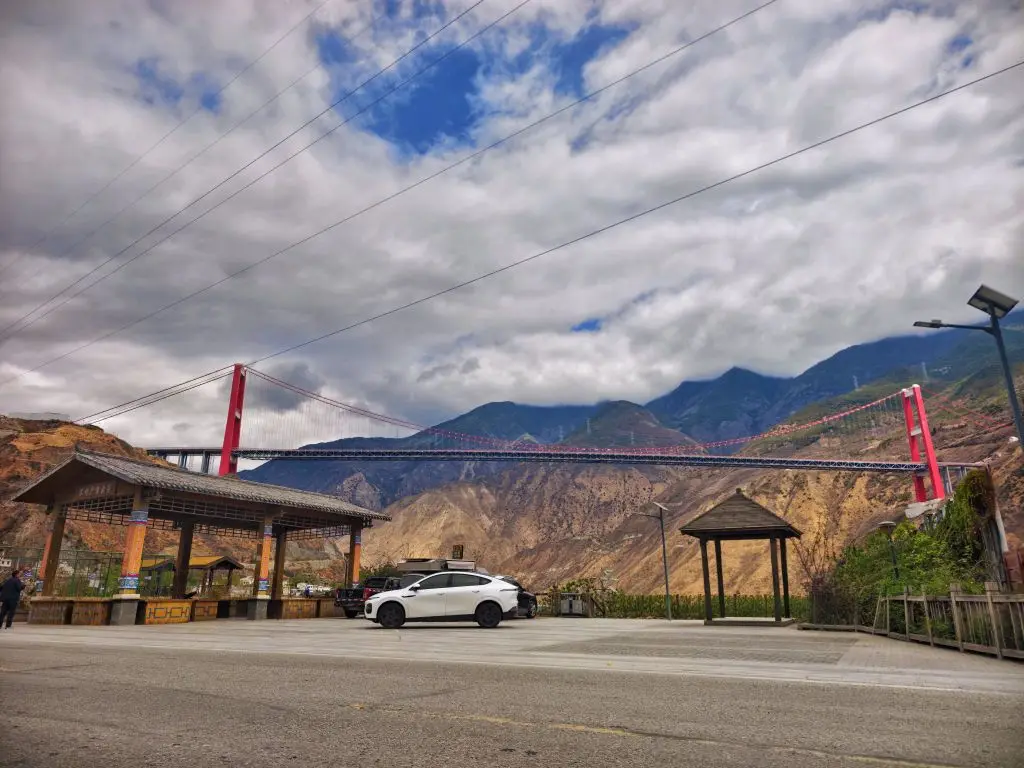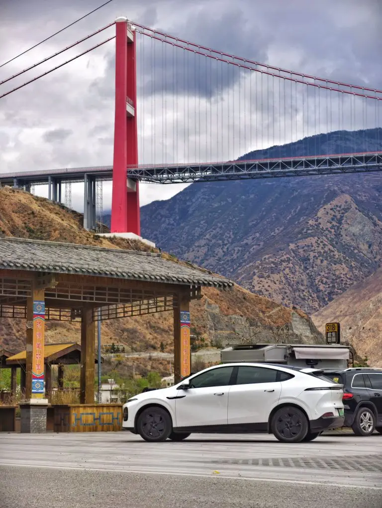 天气真的绝了,万里无云,蓝天配着大渡河的青山,红色的桥身特别出片。我直接用手机拍了爱车和大桥的合影,完全不用修图,原图就很好看,氛围感拉满。