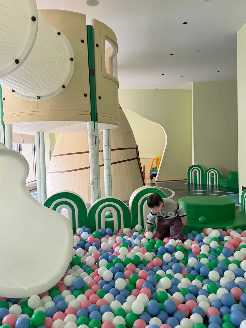 除了房间里的“私享乐园”,酒店一楼还有超大的公共儿童娱乐区,海洋球、攀爬架应有尽有,空调足足的,再偶尔拍几张可爱的照片,彻底实现“躺平式遛娃”。我们下午也基本就泡在酒店。