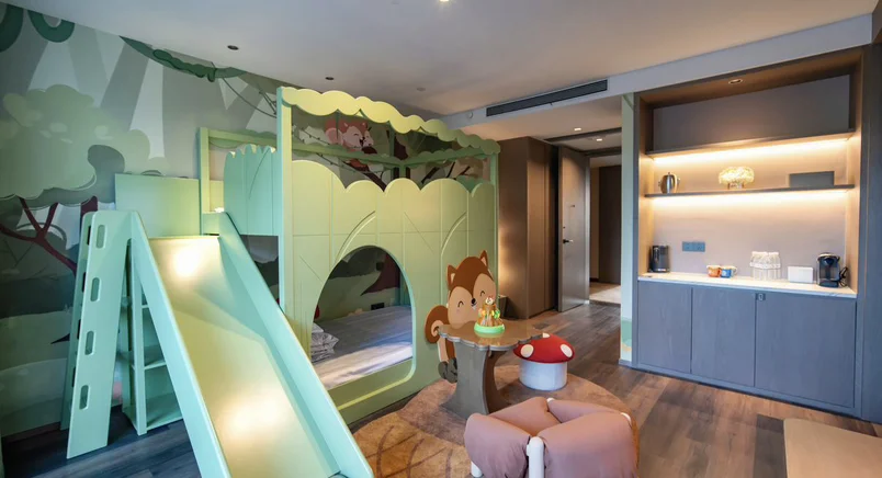 我们定的是亲子房,自带滑梯,一进门小朋友就尖叫着扑了过去,玩得根本停不下来,上上下下滑了几十遍,笑声就没断过。房间布置也超用心,卡通玩偶墙、可爱的小帐篷,还有专门为宝宝准备的小马桶、踩脚凳、儿童洗漱用品,细节拉满,果然没让人失望。