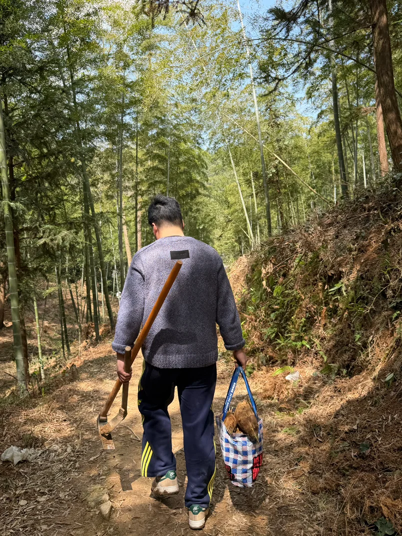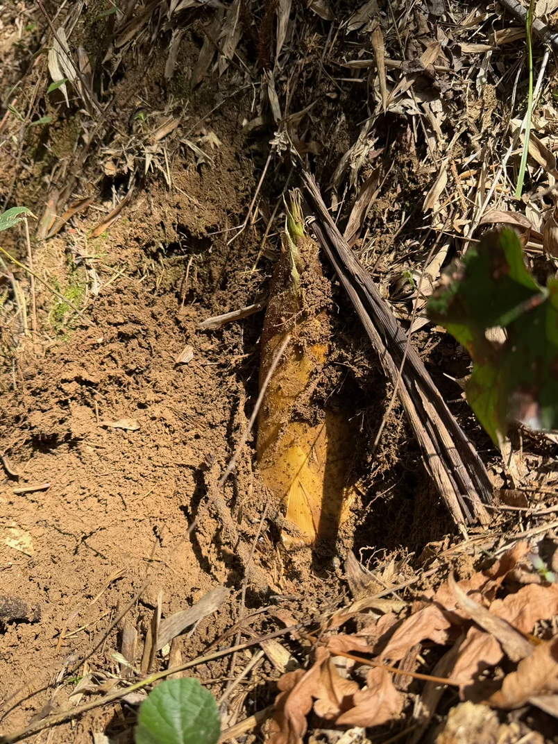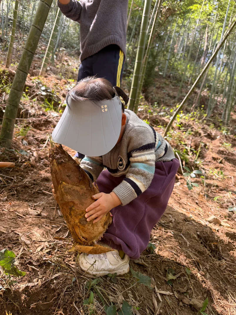 挖笋看似简单,其实藏着小技巧,要找地面微微鼓起、有裂缝的地方,下面多半藏着肥硕的春笋。小朋友拿着小铲子,有模有样地在竹林里“寻宝”,一开始找不到,急得团团转,在我们的指导下,终于挖出第一颗春笋时,兴奋得又蹦又跳。虽然只挖了短短一小时,但收获满满,袋子里装满了大大小小的春笋,成就感爆棚。