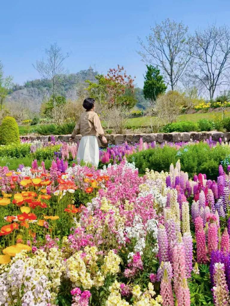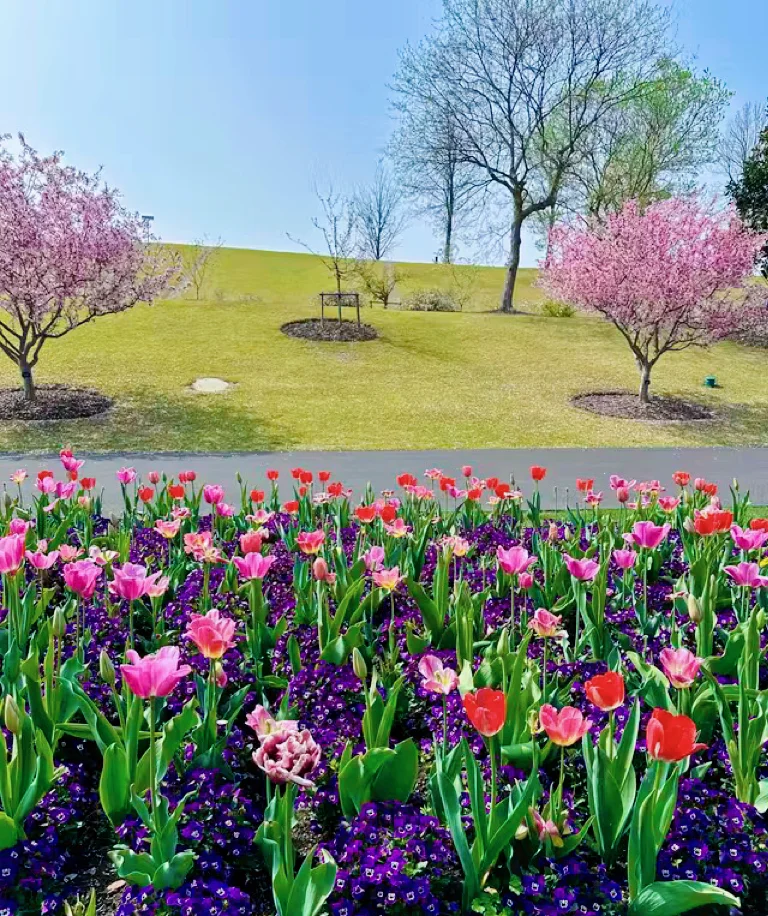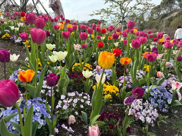 郁金香也是另一番风景。听介绍说园内一共种了53个品种,红的、粉的、黄的、白的都有,花型有单瓣也有重瓣,散落在好几个地方。我们经过外广场和电瓶车道时,路边大片大片的郁金香连成花毯,和角堇、喜林草套种在一起,色彩层次很丰富。