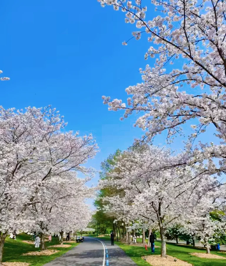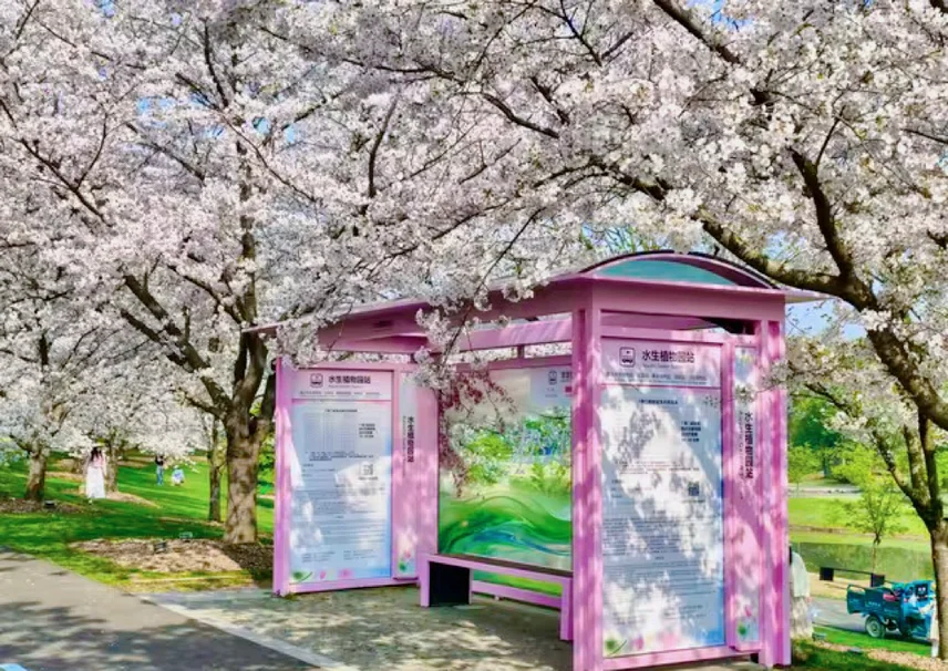 辰山植物园的樱花大道,全长近千米,染井吉野樱正值盛花期,花开得铺天盖地,抬头就是浅粉色的花海,风吹过就飘起一阵“樱花雨”。我和娃正好赶上最佳观赏期的尾巴,满树的樱花白中透粉,密密匝匝缀满枝头,像撑开了一把巨大的花伞。娃在树下仰着头看了半天,然后蹲下来捡花瓣,小心翼翼地装进口袋里,说要带回去送给小朋友。