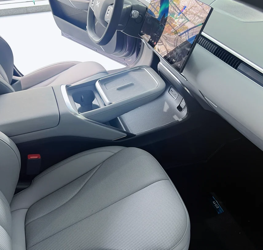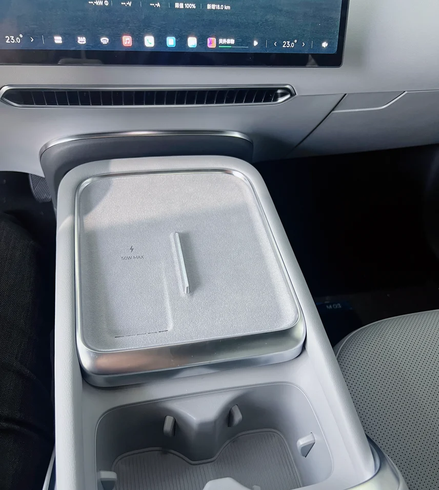 新款MONA M03的中控台跟老款完全不一样了。以前是传统的一体式设计,现在换成了悬浮式中控台,整个中央通道像是漂浮在座舱里一样,视觉效果很轻盈,上下也更有层次感。最实用的是,原本只有一个无线充电位,现在变成了两个——主驾和副驾各一个,都是50W快充,带风冷散热。两个人出门再也不用抢充电板了。悬浮设计的好处还不止这些,中控台下方掏空了一块,多了个不小的储物空间,放包、放纸巾、甚至放双平底鞋都挺方便。整体看起来更简洁,用起来也更顺手。