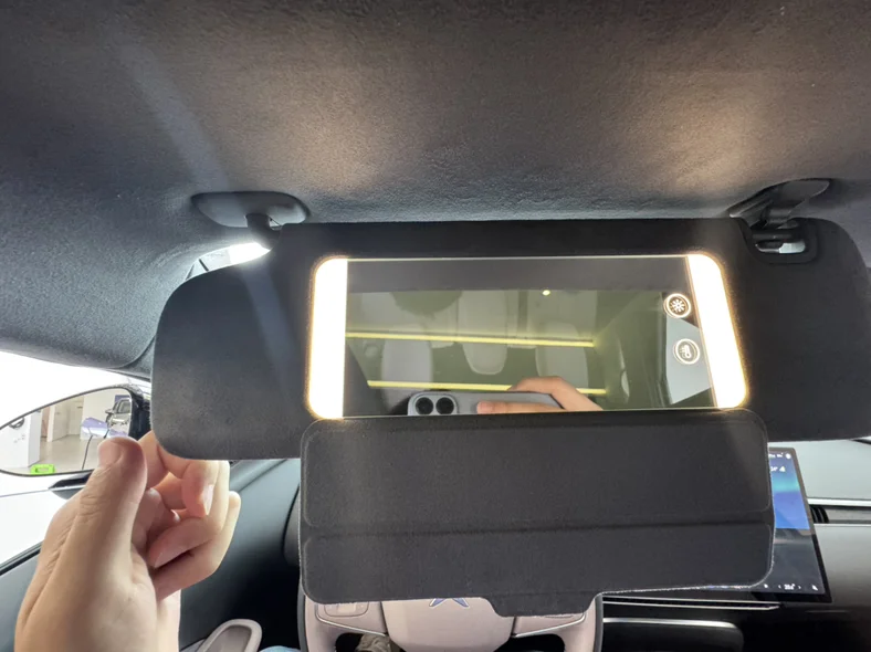 超宽大的美妆镜+色温可调,补妆找光,真的太用心了吧,非常懂女生哦。这个化妆真的设计真的是小鹏非常的从女性用户的一个角度进行设计,真的非常的懂用户的角度和用户的需求。