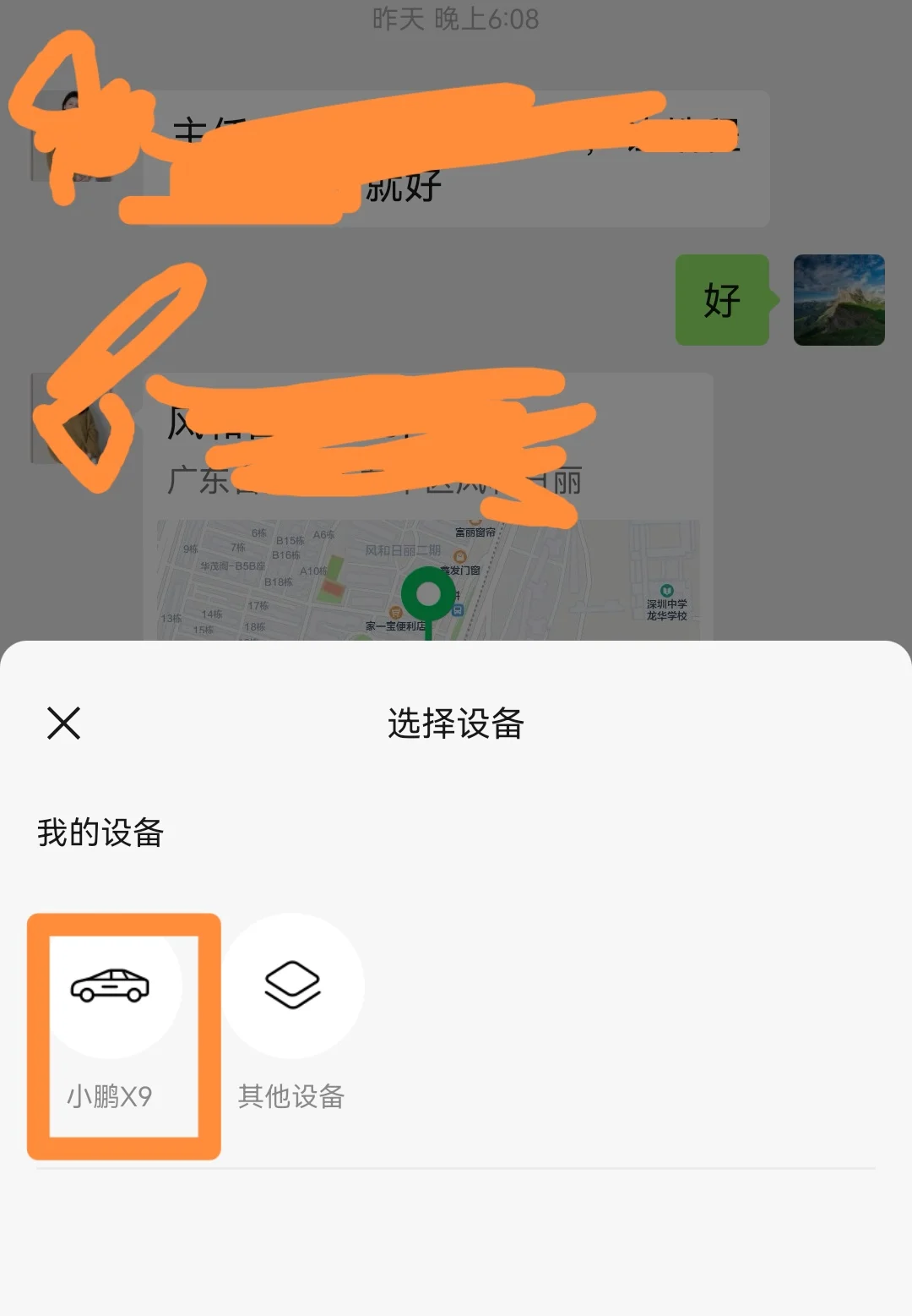 高德地图还可以手机和车机联动,微信里收到定位,长按点“打开”,直接选“小鹏X9”,目的地一秒发送到X9,车机高德地图自动规划最优路线,懒人出行再也不用手动输入目的地址了,方便到哭!