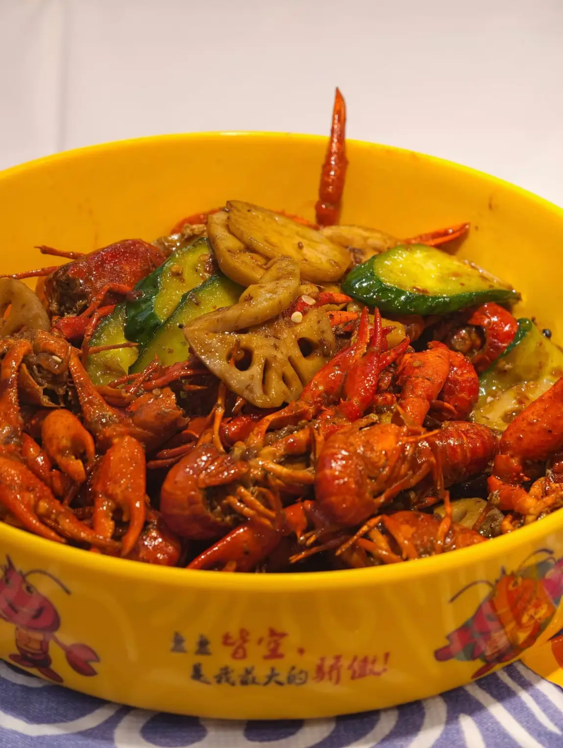 但最让我惊喜的是这个“炫酷黄碗”麻辣小龙虾!碗上印着可可爱爱的宣言:“盆比盆都是宝,是我最大的骄傲!” 瞬间被可爱到!味道也超绝,麻辣味更加浓郁醇厚,还加入了脆脆的藕片,口感层次超级丰富。