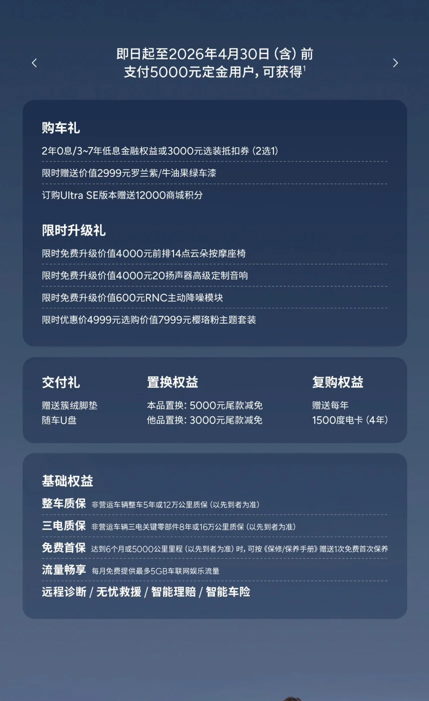 • 置换/复购福利加码:本品置换5000元尾款减免,他品置换3000元减免;复购用户每年1500度电卡(4年),老用户福利拉满,口碑持续发酵。