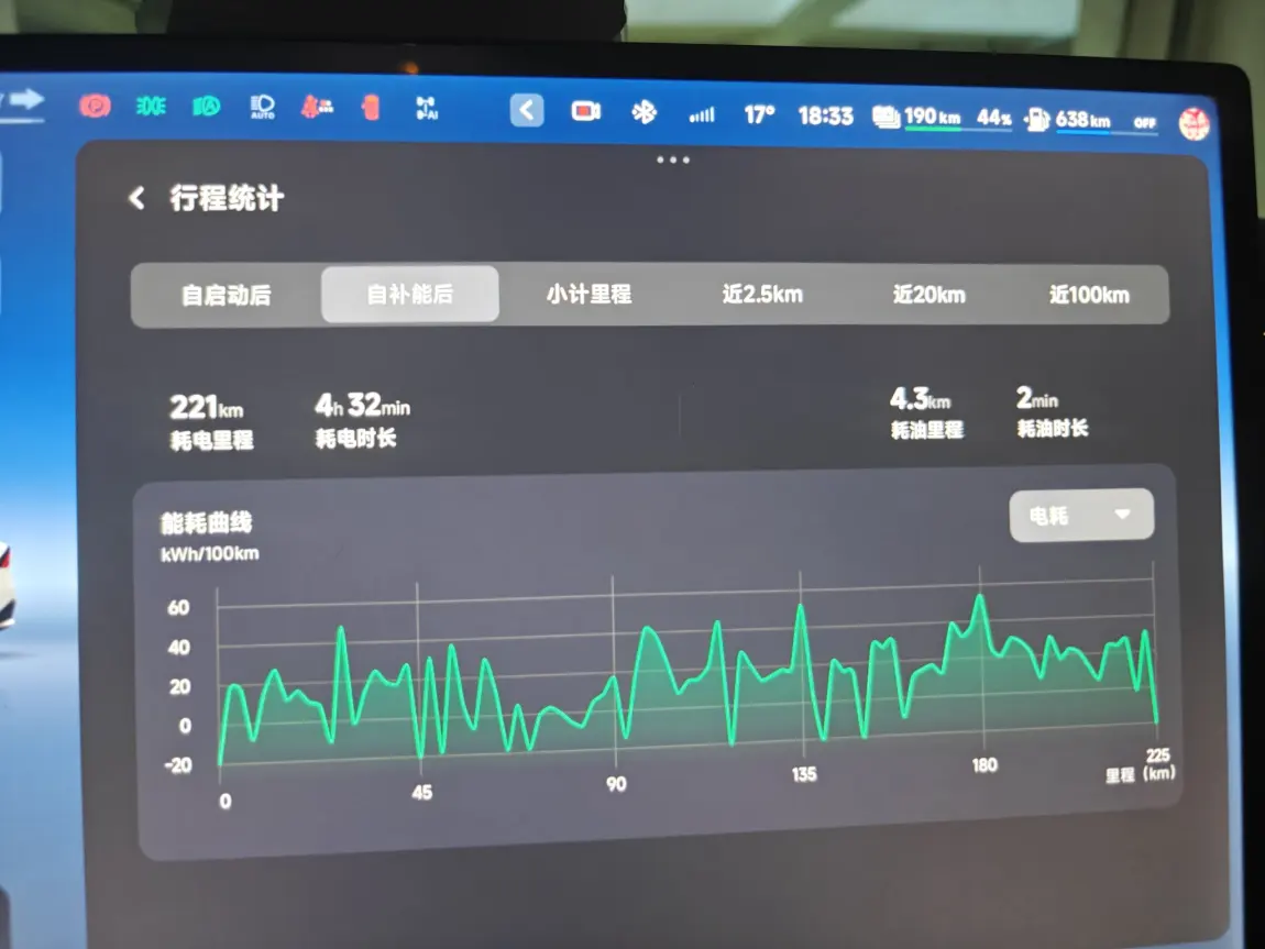 全程大概220km ,满电出发 ,大部分是高速 ,顶着限速跑 ,但是部分路段拥堵 ,220km耗了55%的电,算下来纯电跑小400km应该问题不大 。中间有两三公里开增程器 试了一下噪音 ,讲道理 高速上是听不出来增程器的声音的 。回头试试市区