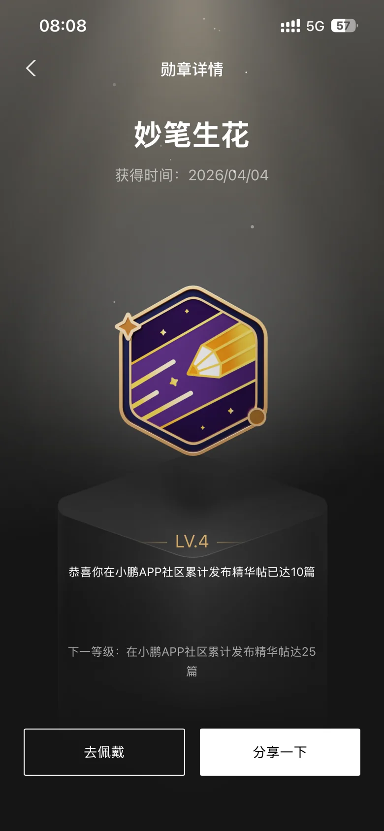 起初,我只是一个为了参加活动而分享的普通车主。如今我却成为了妙笔生花4级勋章拥有者。给到我的感觉,真的感到成就感满满🎖️