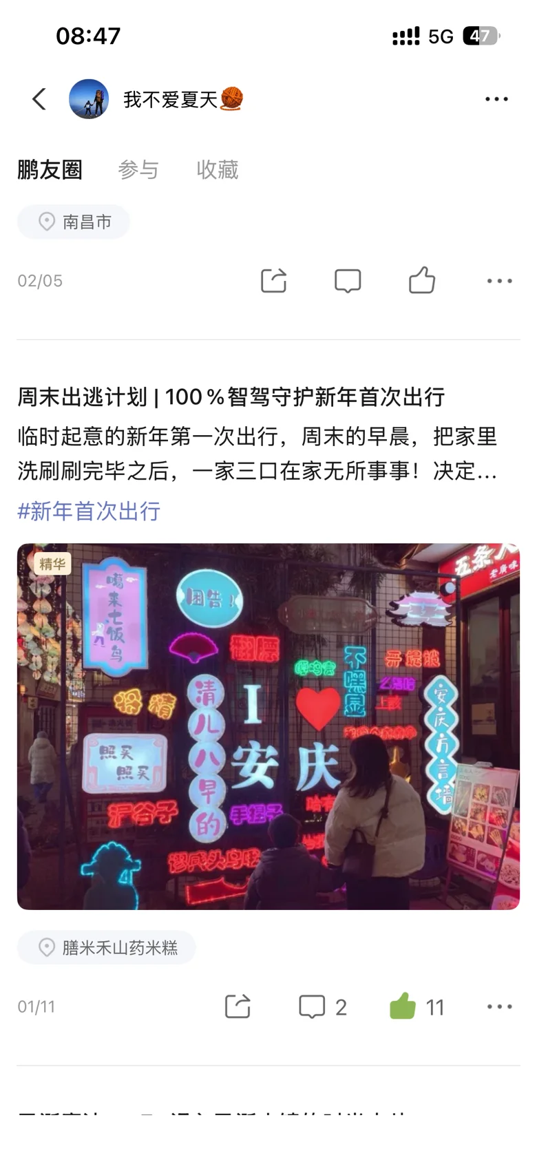 去年,有时候打开社区,看到鹏友们写的非常棒的文章,我也偶尔分享我的生活。直到今年一月份,我带着家人去安庆玩了一趟,有鹏友跟我说,玩的时候多拍点好看的照片嘛,增加自己的心情,还可以发社区发精华赚积分。