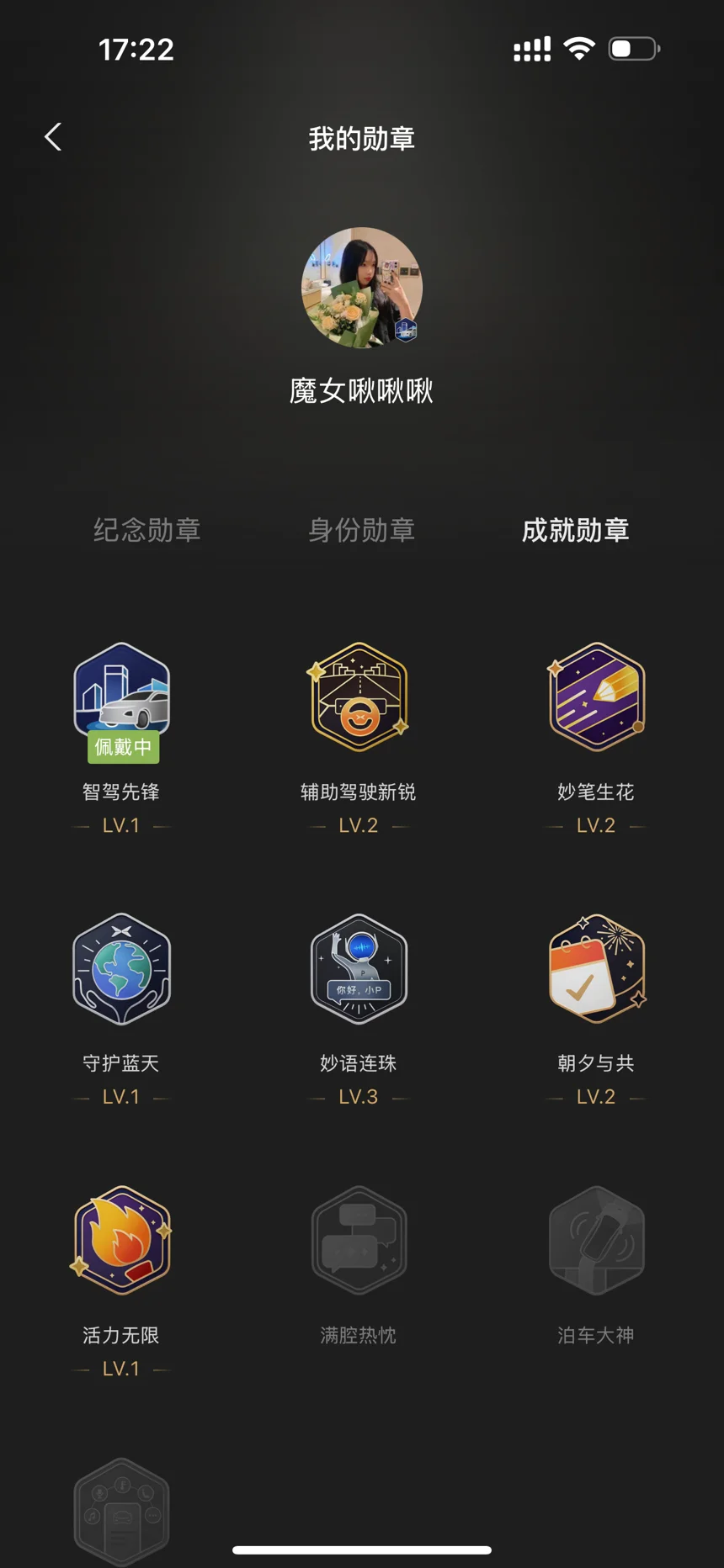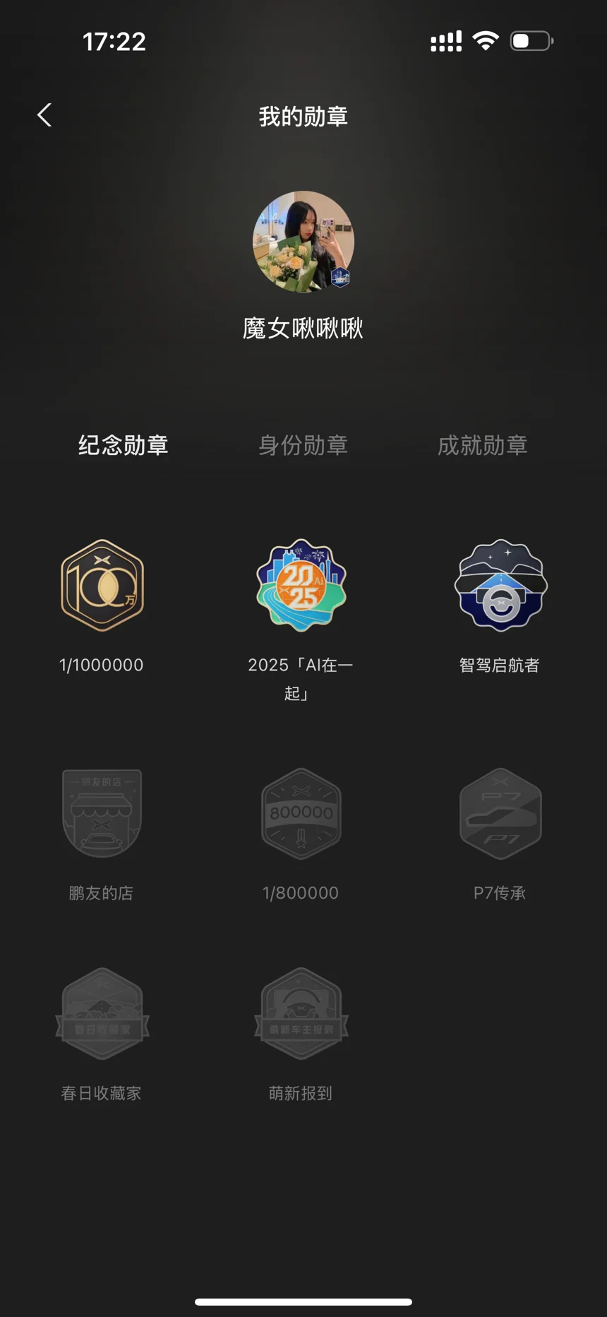 #晒晒我的勋章# 不知不觉,已经在小鹏APP获取了10个勋章要说最最最印象深刻的,还是100万份之一的勋章,我由衷地为小鹏感到开心🥳也更坚定自己没有选错车,100万人与我同在💌