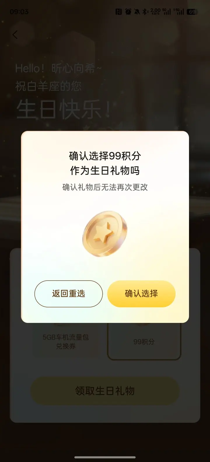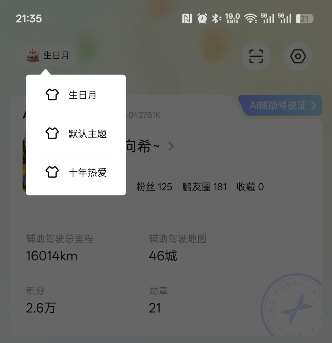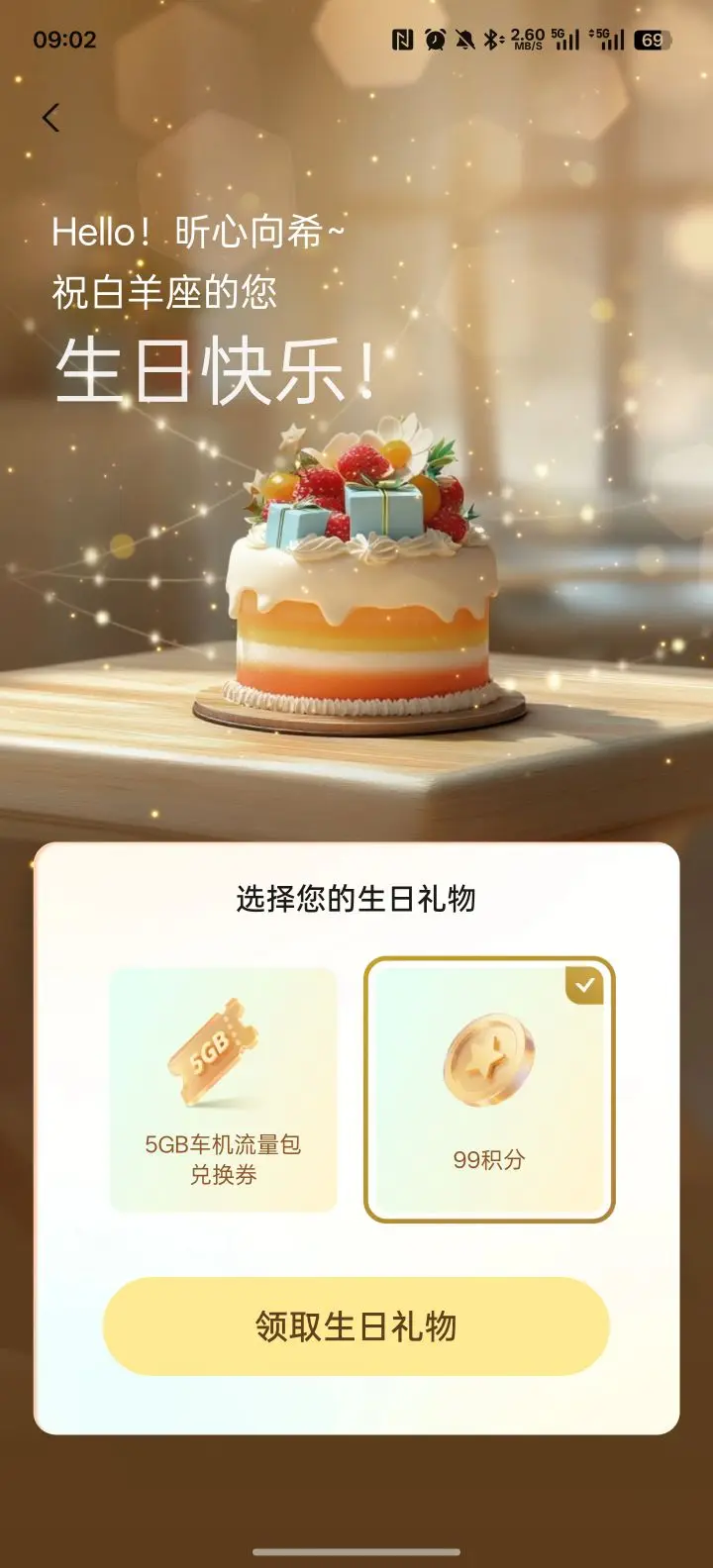 早上九点准时收到小鹏送来的专属生日祝福,今年福利还升级了,支持5GB流量与99积分二选一兑换。平时流量够用不缺额度,果断直接选积分入账,简单又实在。APP里还有生日月定制主题界面,细节做得特别暖心氛围感拉满,我的生日一整天,从打开小鹏APP的这一刻正式开场。