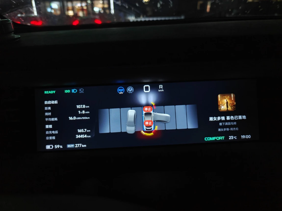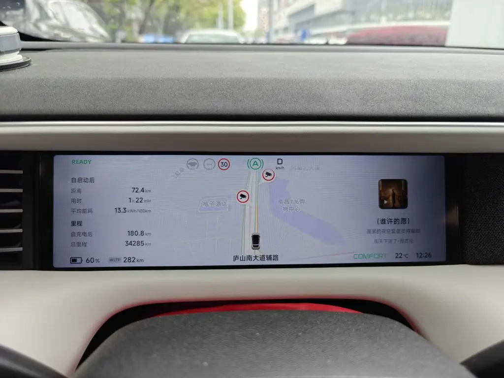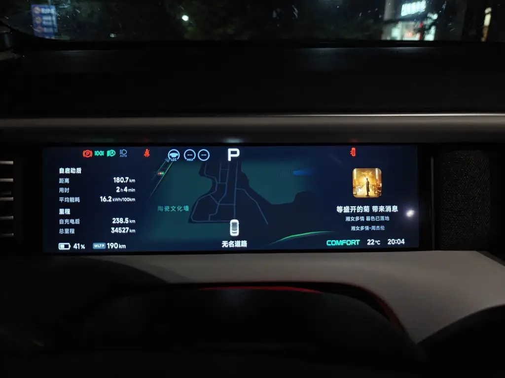 晚上八点平安到家仪表盘再送惊喜:剩余续航190km,比出发预估160km足足多出近30km里程。从南昌高速服务区开回家,两小时跑完180公里,山路+高速混合路况、平均时速90km/h,综合能耗低至16kWh/100km,全程表现稳稳当当。