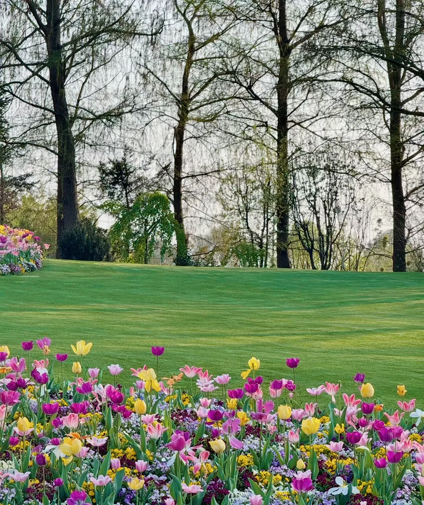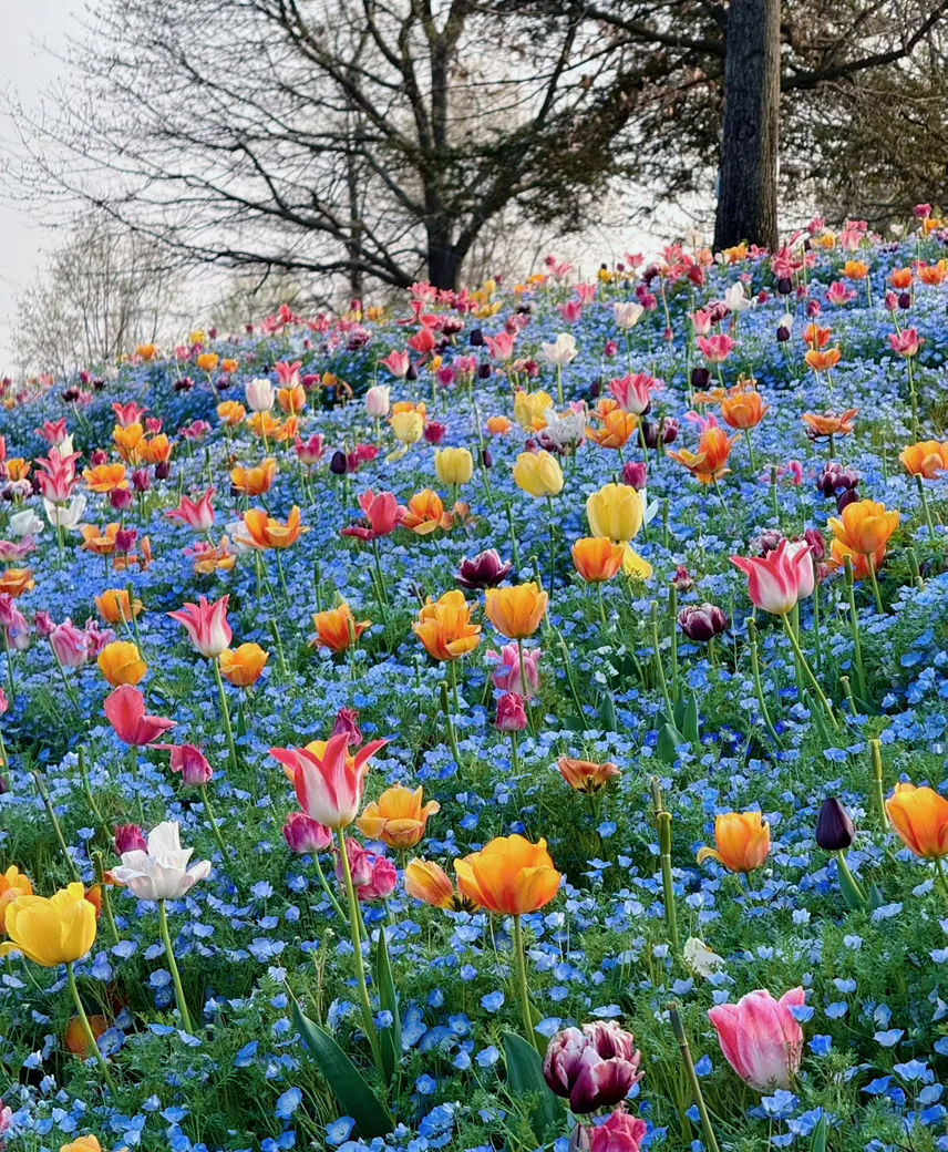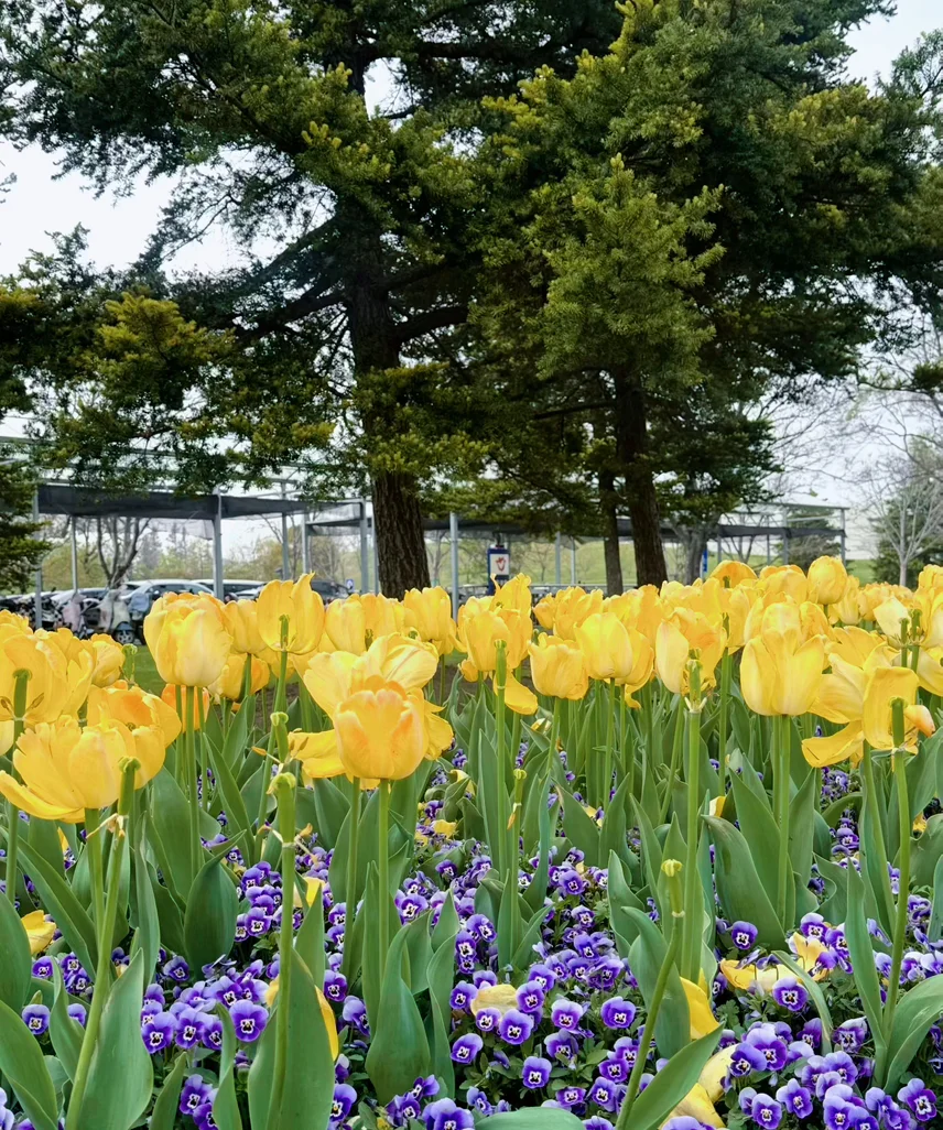 园内的郁金香也开得正盛,53个品种,红的粉的黄的白的,单瓣重瓣都有,和角堇、喜林草种在一起,层层叠叠的色彩,看一眼心情都变好。