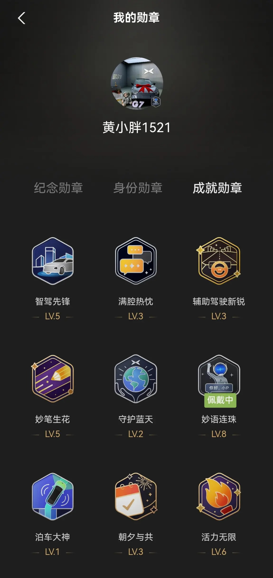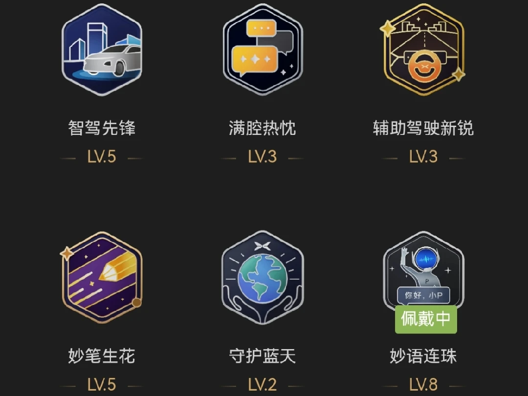 · 勋章故事: 10000次语音指令!这可不是个小数目。仔细想想,我几乎每天都在用,“小P,导航回家”、“小P,打开座椅加热”、“小P,播放周杰伦的歌”……这枚勋章,是我和小P之间越来越有默契的最好证明。