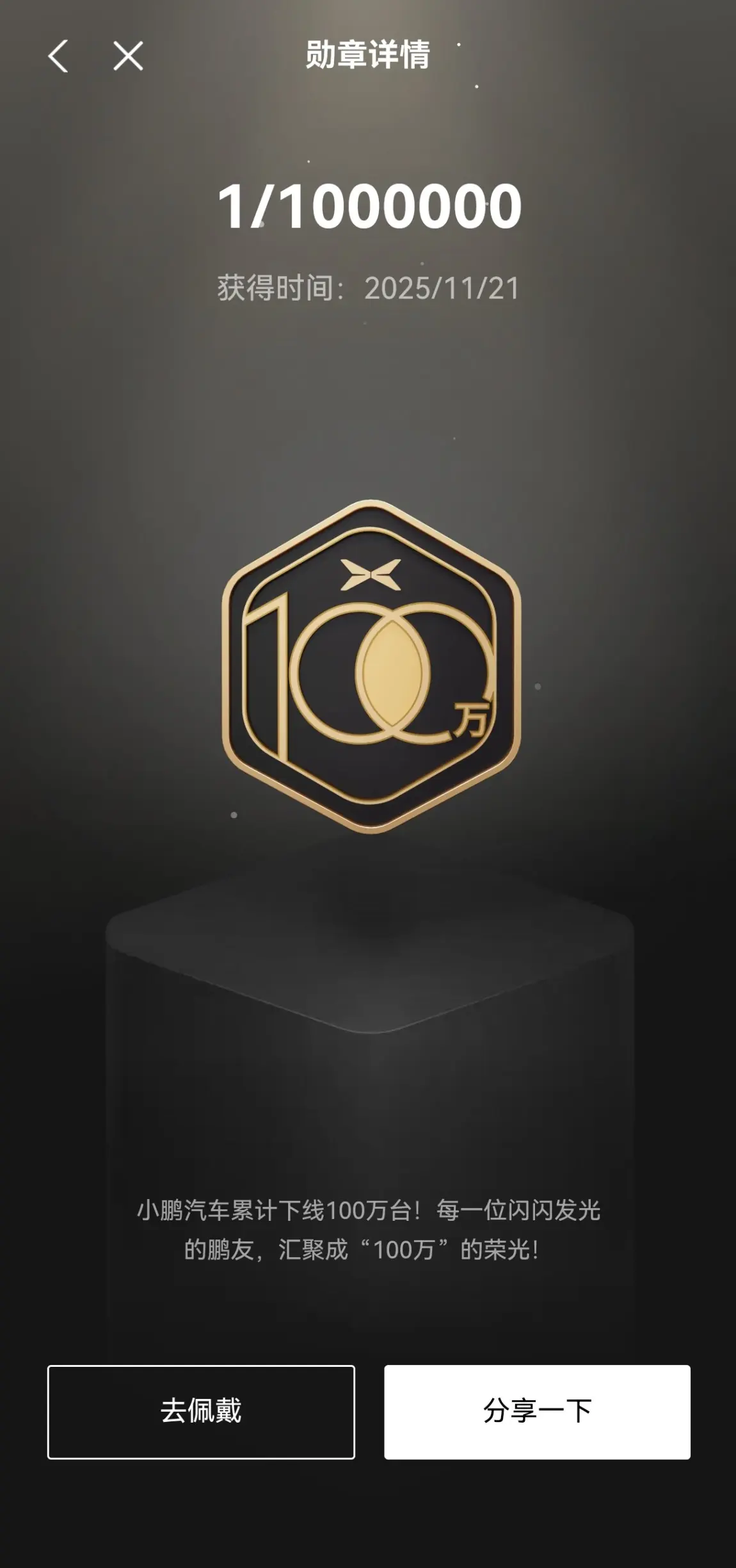 · 勋章故事: 这枚勋章的分量非常重!当看到小鹏汽车累计下线100万台的消息时,内心真的很激动。我们每一位鹏友,都是这“100万”荣光中的一份子。这枚勋章,是对小鹏品牌的认可,也是对我们所有车主群体的认同。