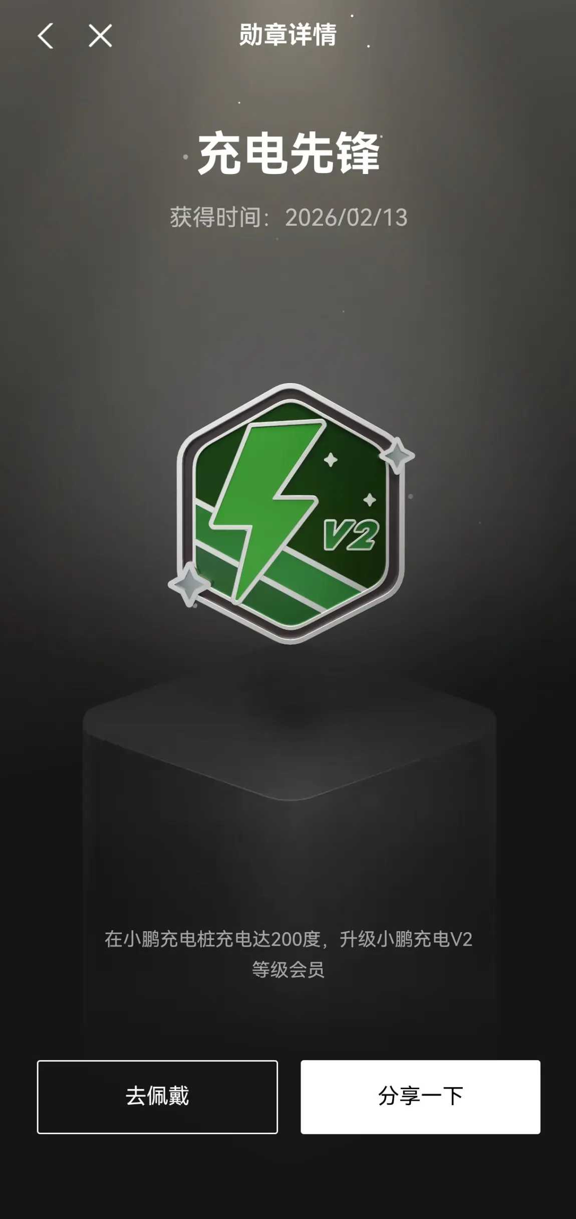 · 勋章故事: 从“充电新星”到“充电先锋”,中间是200度电的积累。这200度电,是我春节自驾回家路上一站又一站补能的见证,也是我逐渐摸清小鹏充电网络布局的历程。拿到“先锋”勋章时,我感觉自己已经从一个新兵,成长为一个可以带队探索的“先锋”了。