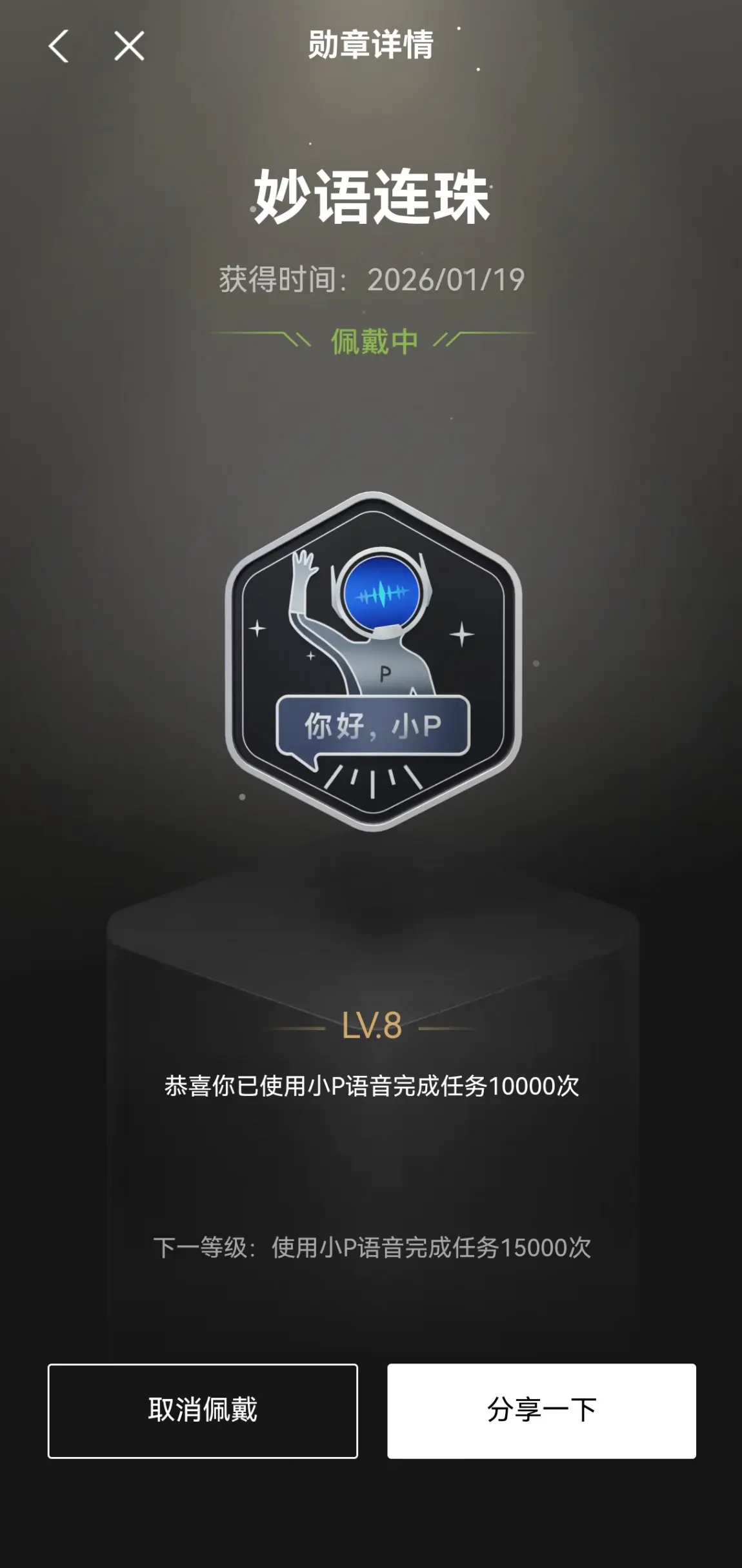 本周佩戴勋章: 我本周佩戴的是【妙语连珠】,因为它时刻提醒我,要多用语音和小P交流,享受这种默契的交互感。