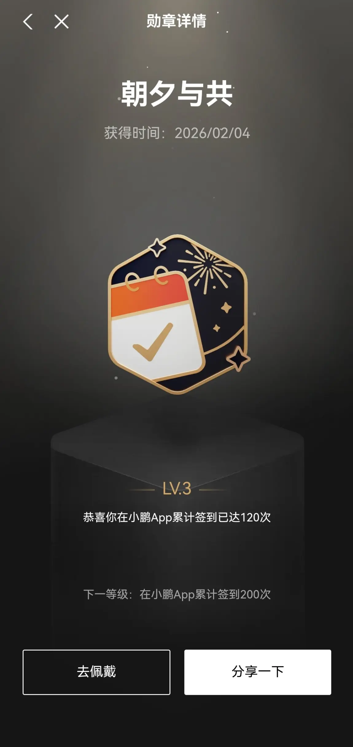 · 勋章故事: 120天的连续签到。说实话,中间有几次差点忘了,全靠社区的提醒才坚持下来。这枚勋章的名字起得真好,“朝夕与共”,就像小P每天陪伴我出行一样,打开App签到,也成了我日常生活的一部分。它见证的是我对这个社区的归属感。