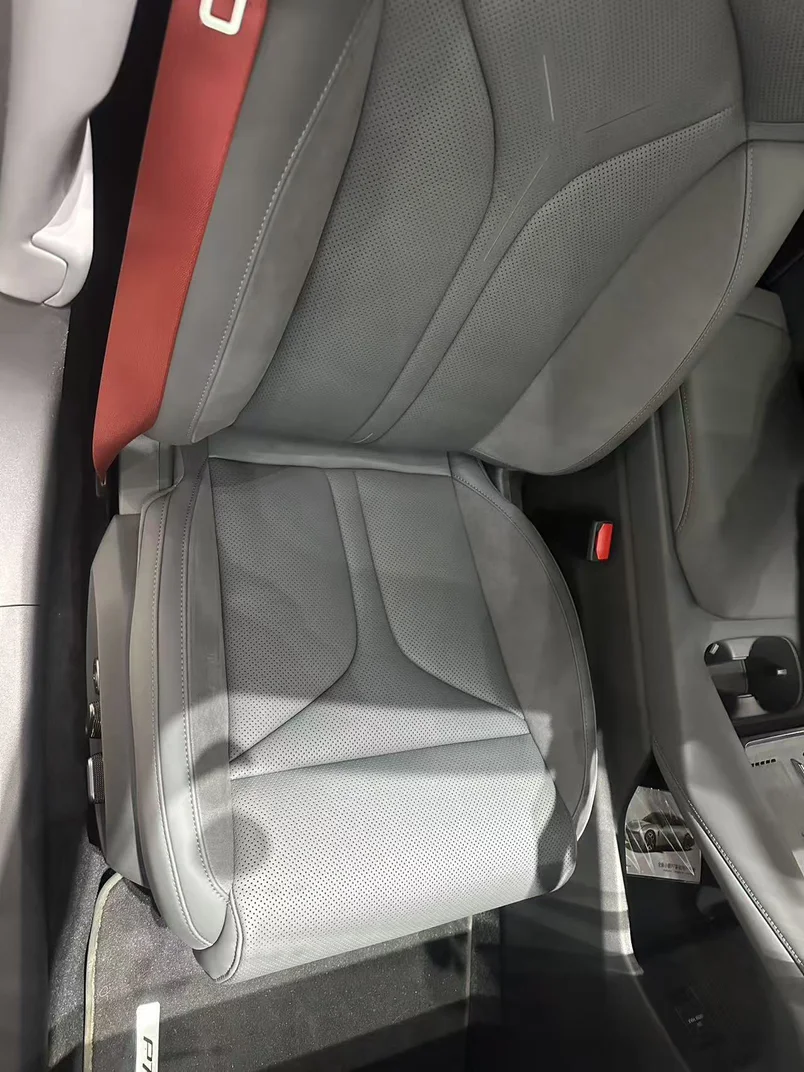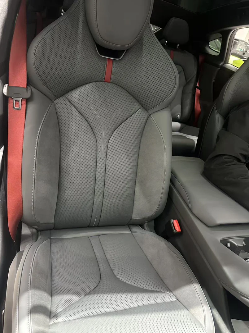 灰红撞色的内饰真的太对味了!灰色麂皮+打孔真皮的座椅,质感直接拉满,摸上去软乎乎的,支撑性也超棒,运动感和舒适感直接拉满。