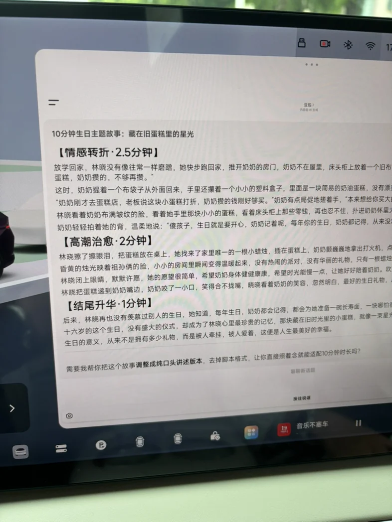 第二个是万能神器豆包,突然开车脑海里蹦出一个问题可以询问豆包得到答案,问天气,问美食,问效率规划,问百科行走的百科全书。再安利一个特别出彩的功能,开车有小朋友在时还可以讲故事还哄娃,和小朋友互动起来让娃坐车可以告别娱乐屏的动画,这一点要大赞一下。