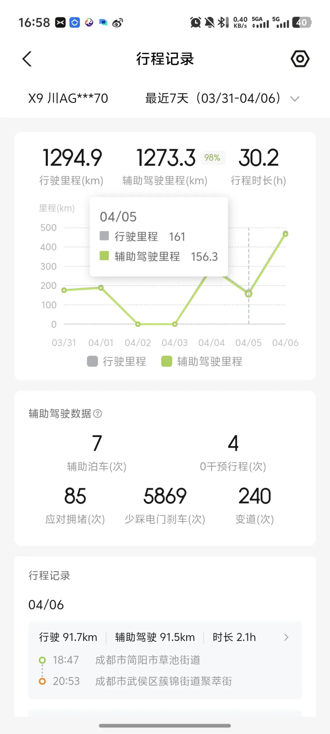 今日行程的智驾数据。总共行驶161公里,智架里程156公里