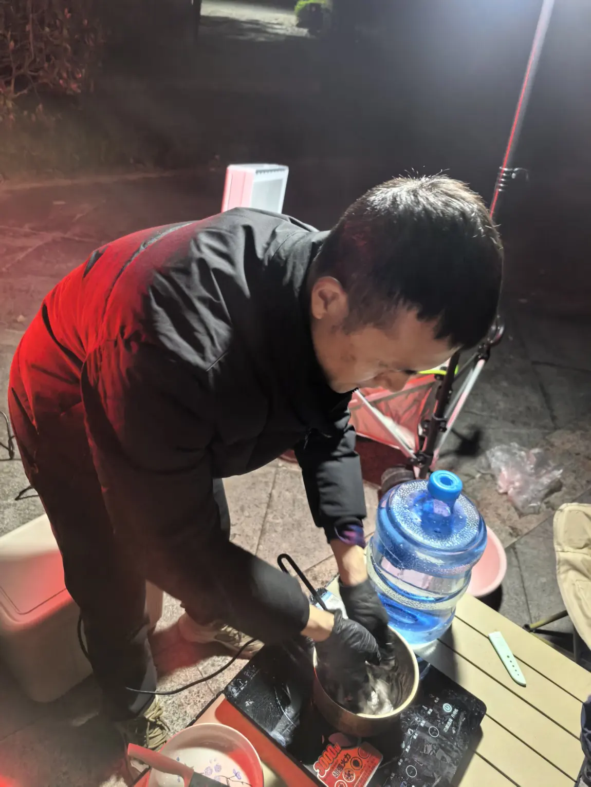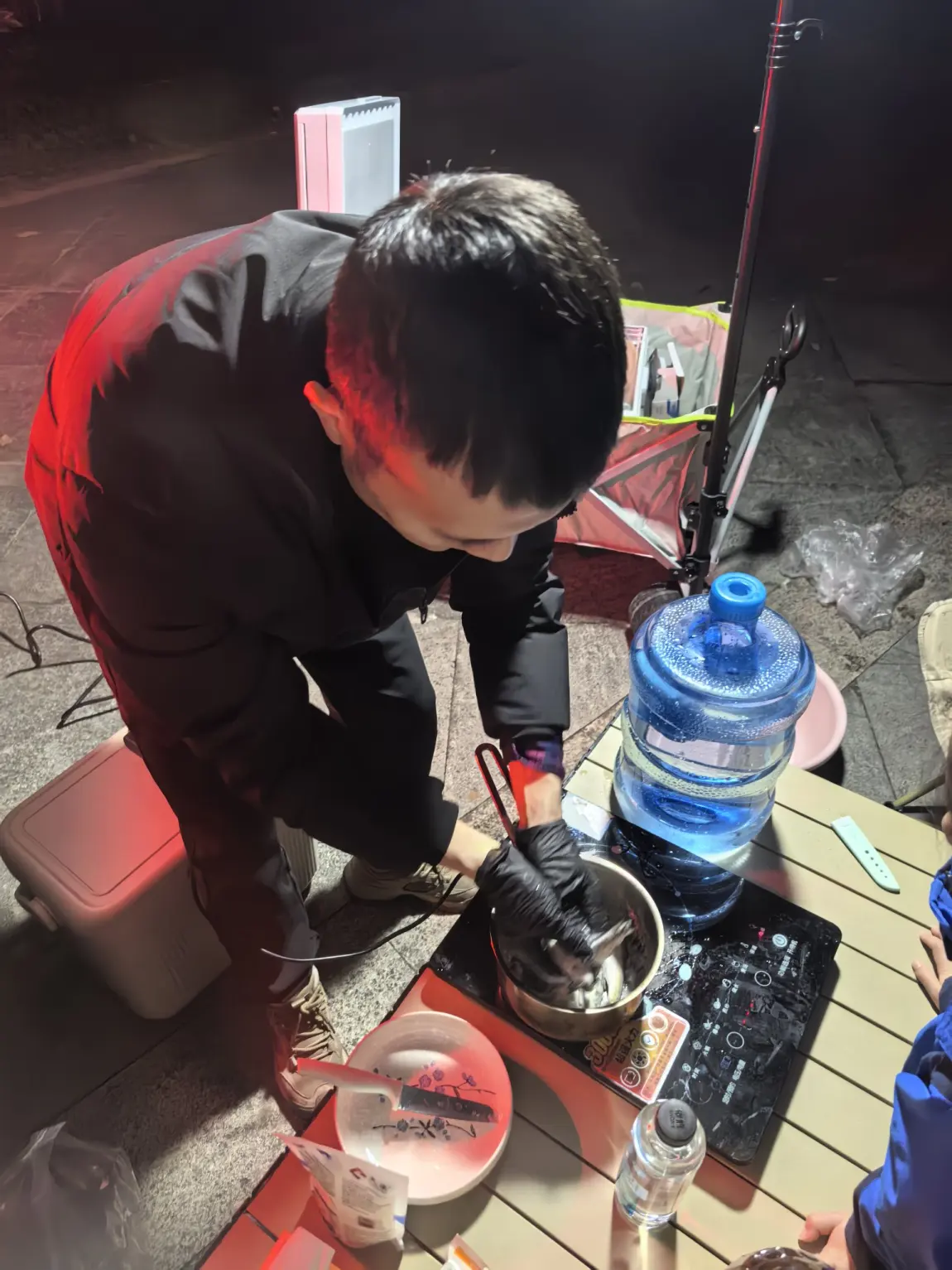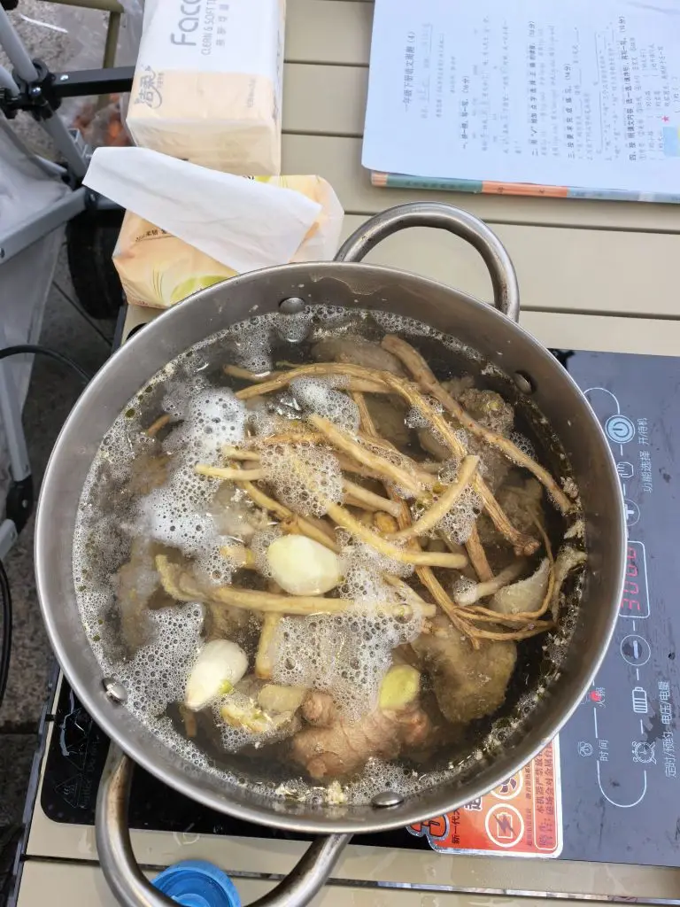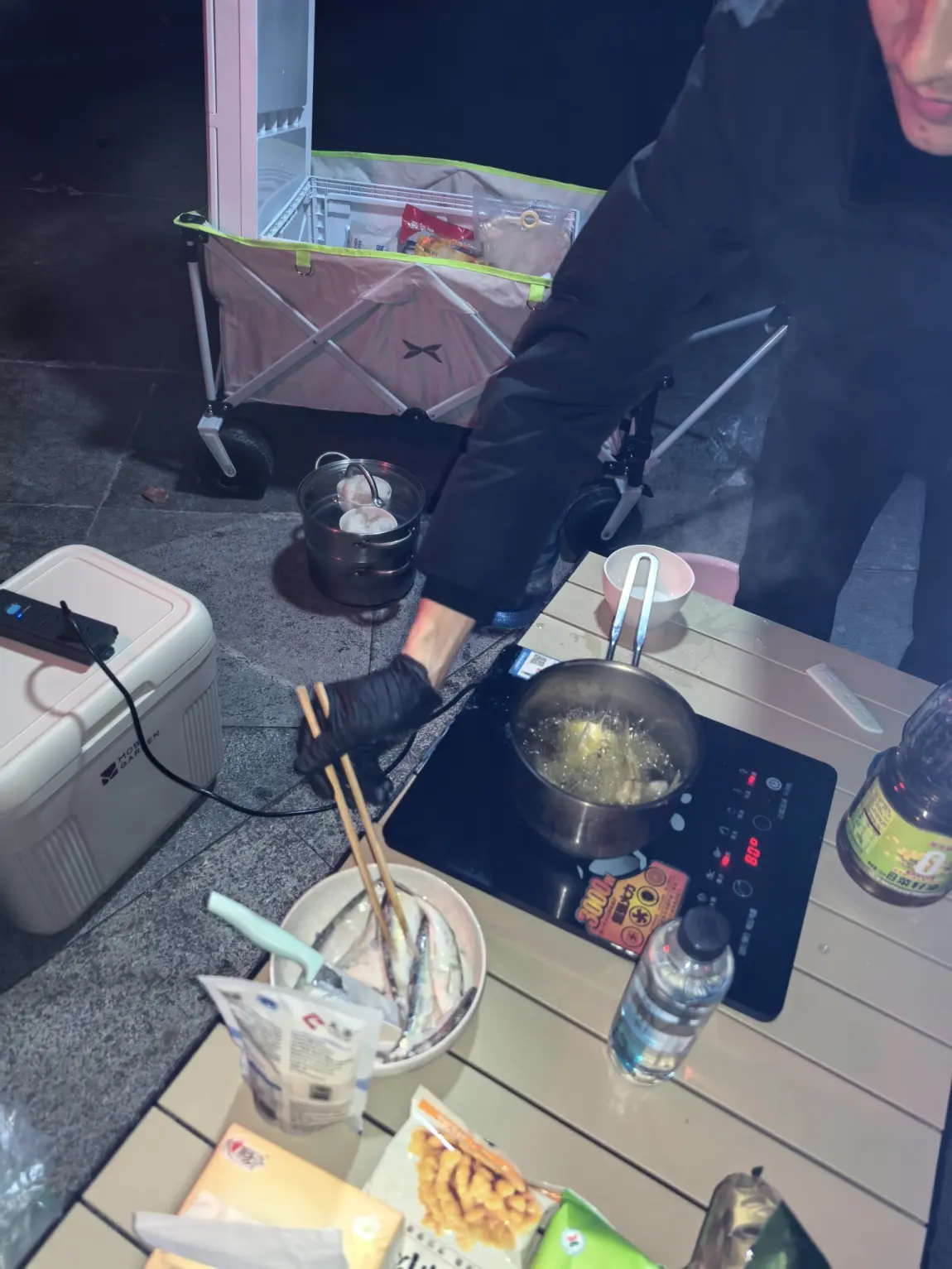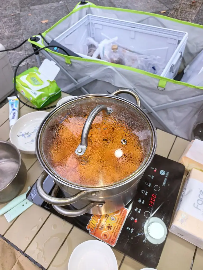 除了炸小鱼,我们还准备了两大锅硬菜:一锅是用党参、生姜炖的滋补肉汤,另一锅是红汤火锅,还有蒸得软糯香甜的红薯、梨,在电磁炉上慢慢焖煮,香气在天幕下弥漫开来。
