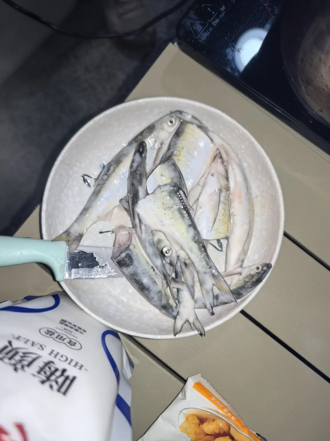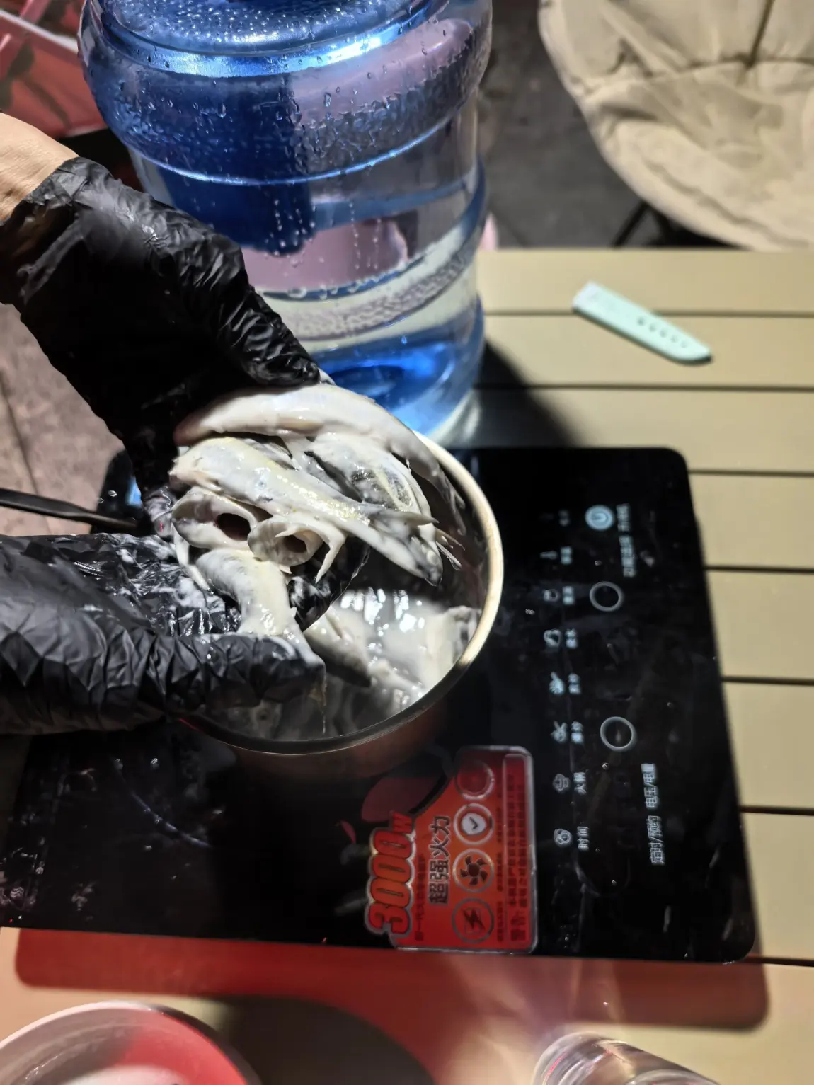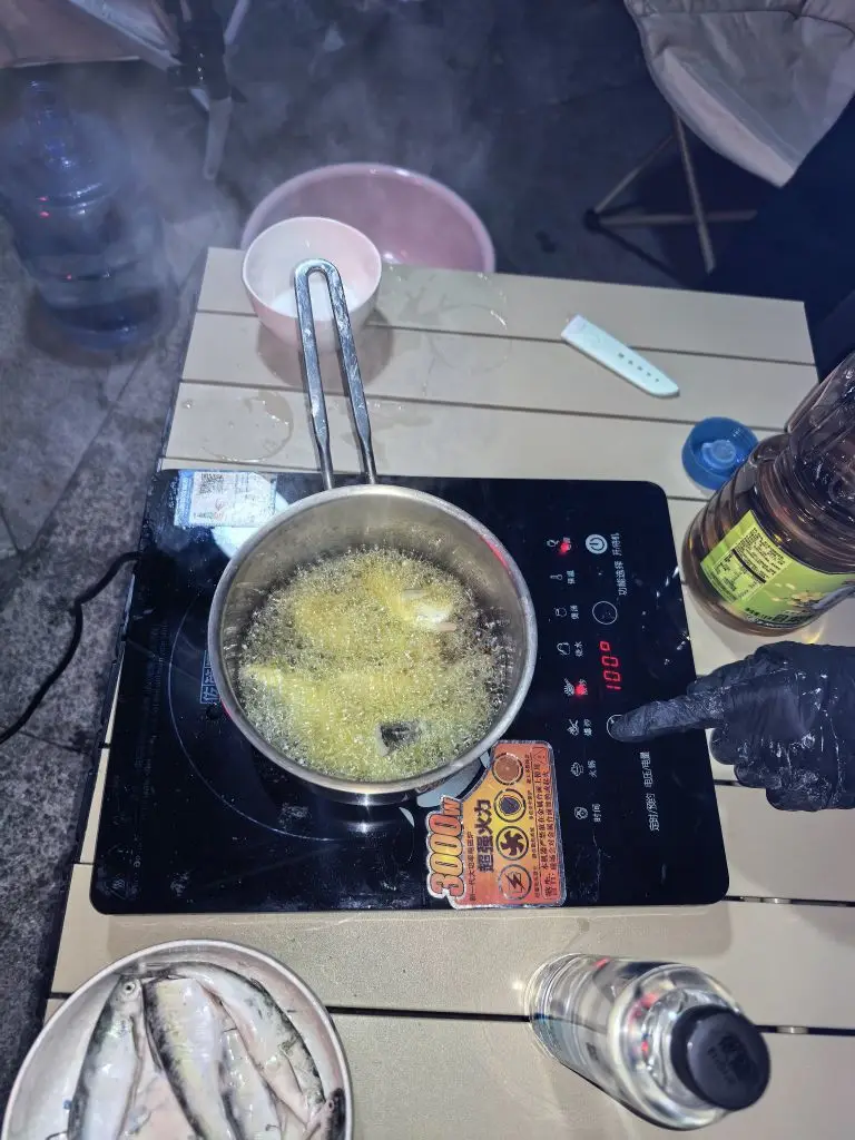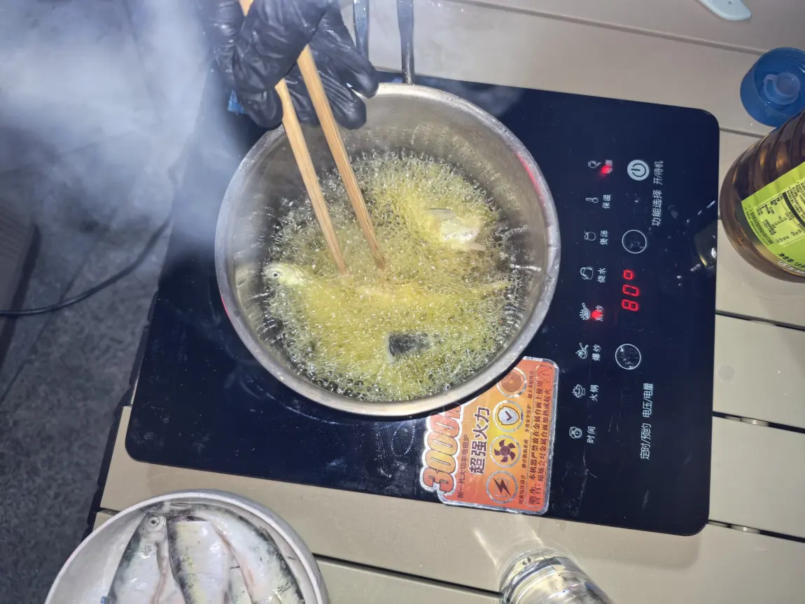 处理小鱼的过程充满野趣:去鳞、开膛、洗净,用盐、料酒简单腌制,再裹上一层薄薄的面糊,油温烧到八成热,一条条下锅。电磁炉火力够猛,油温稳定,小鱼下锅瞬间就炸得金黄酥脆,滋滋的声响混着油香,在江边飘得老远。