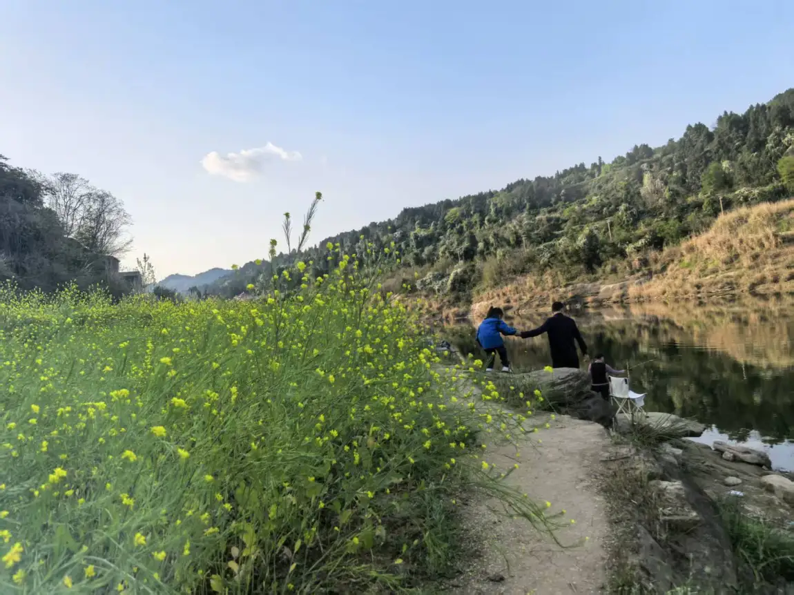 一家人围坐在天幕下,就着江风、花香,吃着热乎的火锅、酥香的炸鱼,孩子在旁边写作业、追蝴蝶,大人聊着天,看着远处的青山绿水,这才是生活该有的样子。