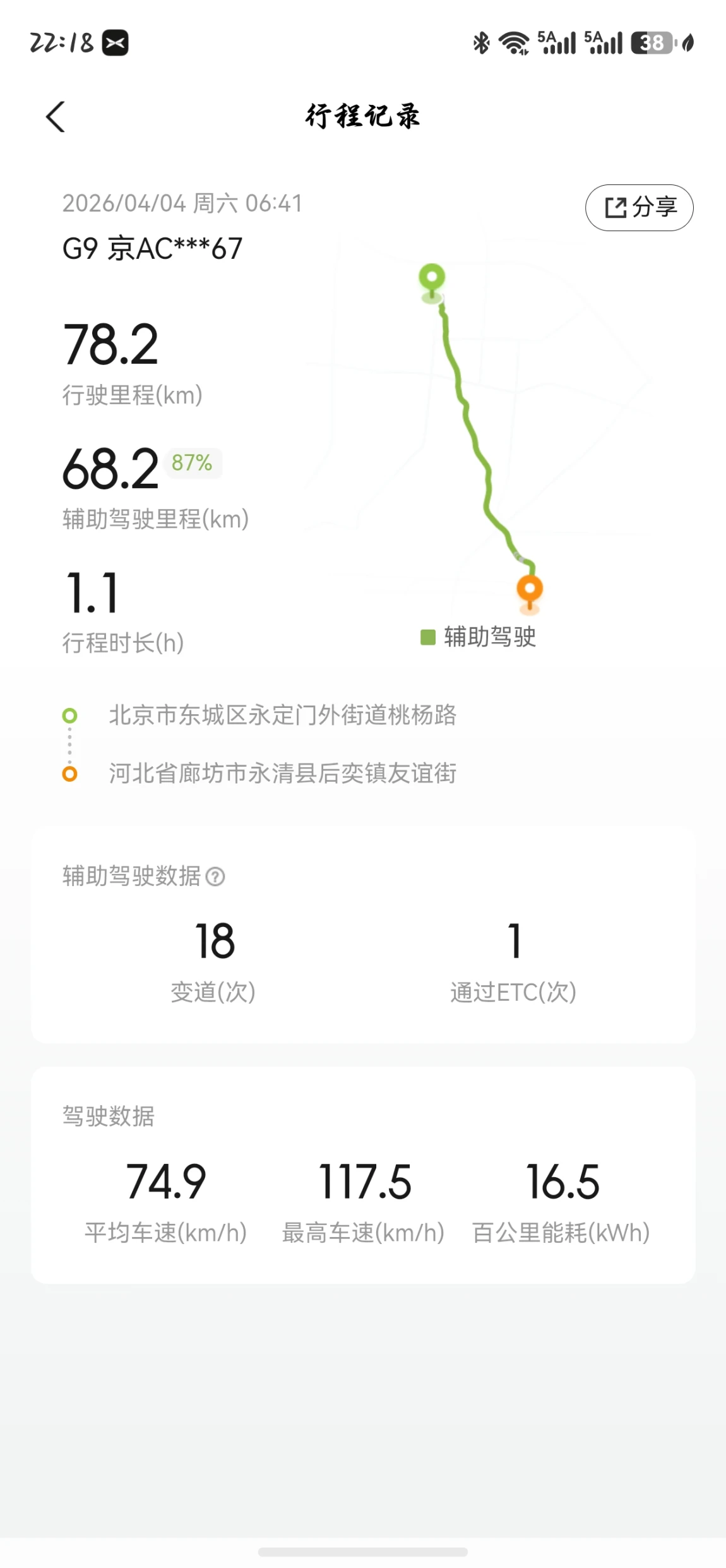 智驾里程:68.2km,智驾占比87%