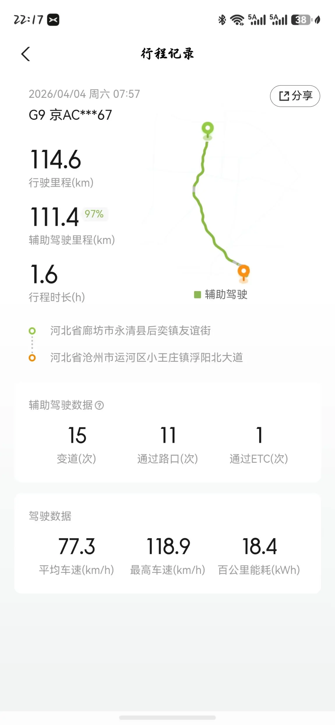 智驾里程:111.4km,智驾占比97%