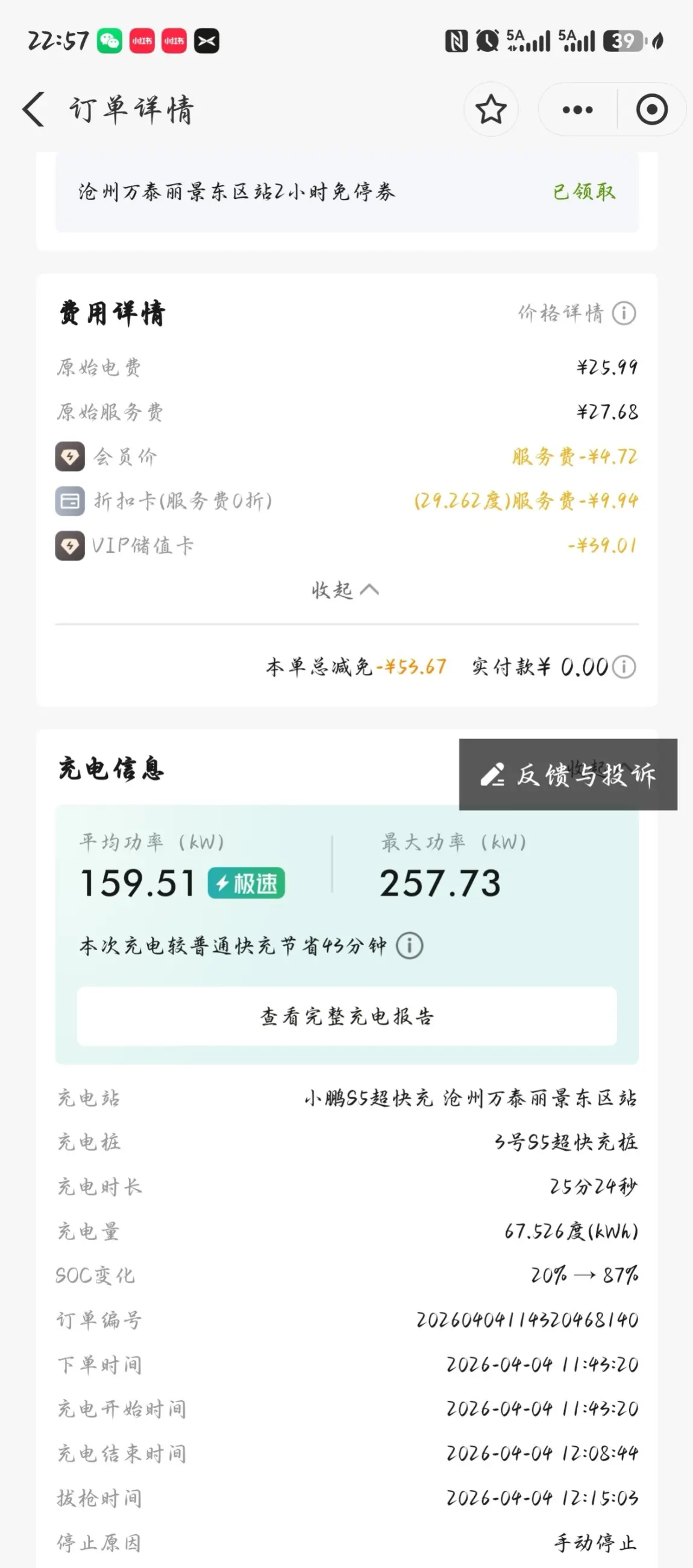 实付金额:0元!(会员价+折扣卡+储值卡减免,直接白嫖充电)