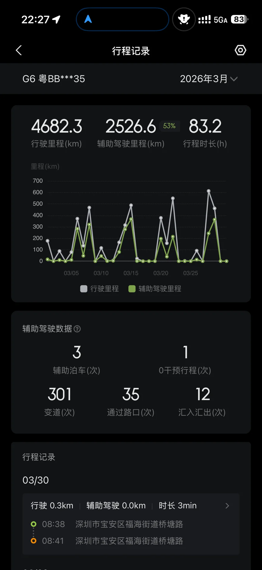 三月份我的G6长途出行格外频繁,整月累计行驶里程达到4682.3公里。其中XNGP智能辅助驾驶使用里程2526.6公里,使用时长83.2小时,超过一半路程都依靠智驾完成。有了可靠的智驾加持,长途驾驶轻松不少,能有效节省近一半精力,不再被长时间开车弄得疲惫不堪,让原本枯燥的旅途变得舒适又省心。