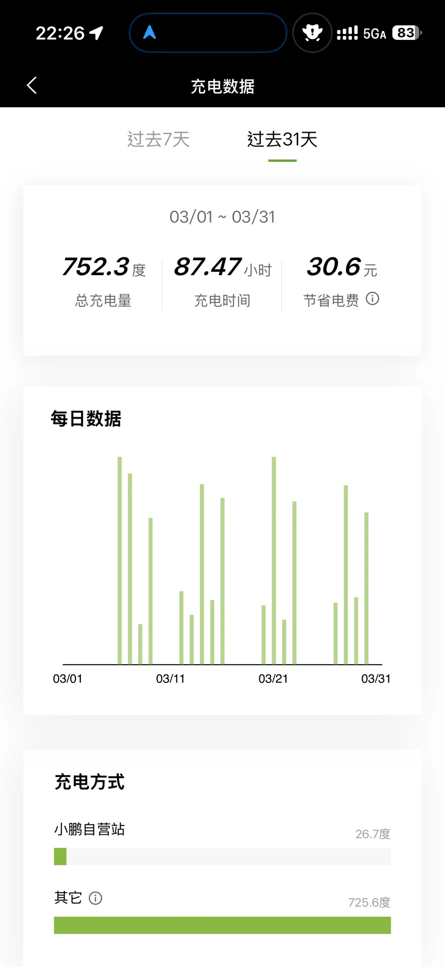 G6在三月份充了752.3度电,停在家里就用7kw慢充,在外面充就用快充。